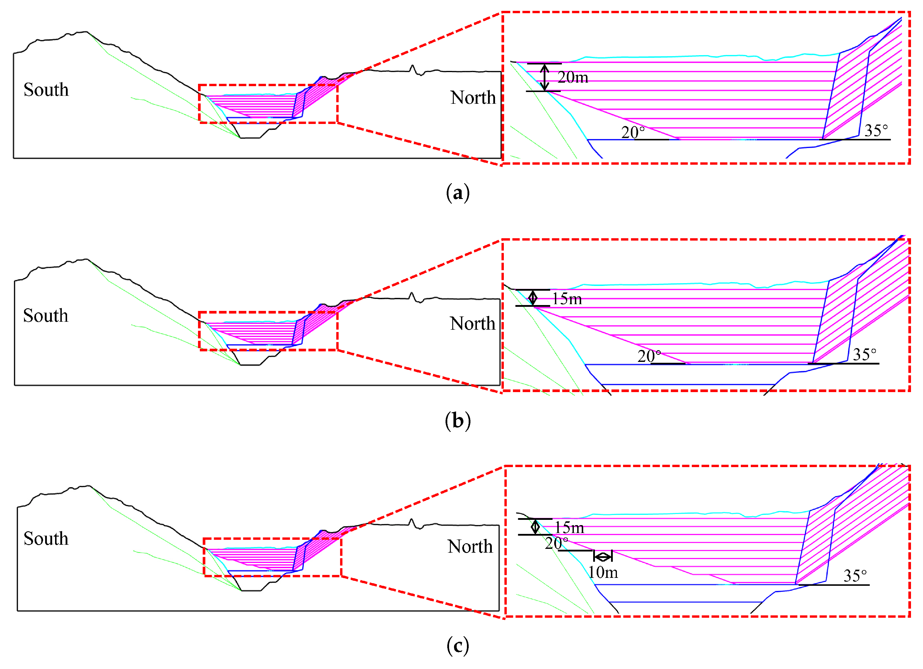 Slope treatment schemes for Section 2. (a) Scheme 1. (b) Scheme 2. (c) Scheme 3. Green denotes the main fractures; cyan represents the outline of the tailings orebody prior to mining; blue indicates the outline of the waste rock orebody before excavation.