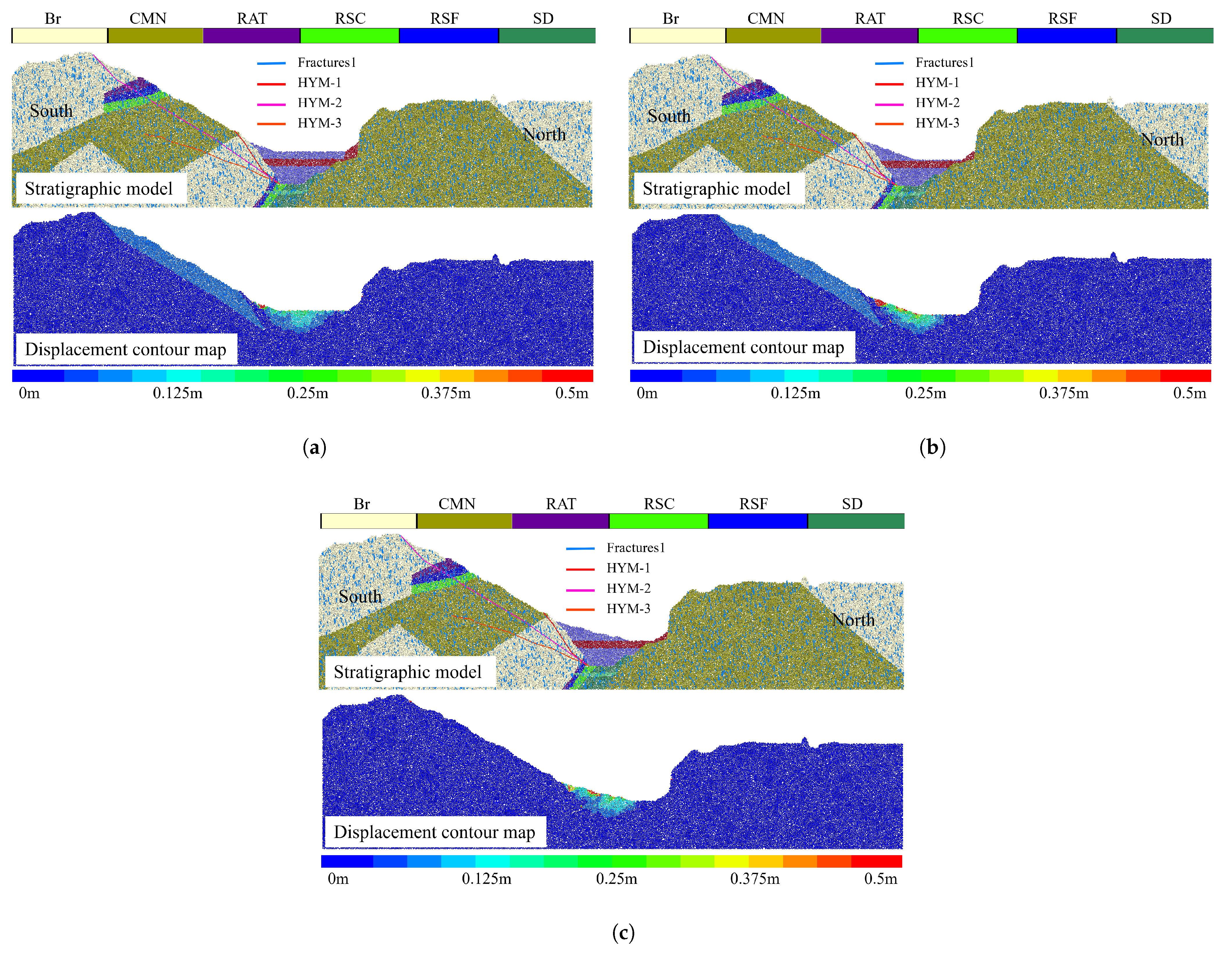 Simulation results after slope treatment for Sections 3 to 7. (a) Section 3. (b) Section 4. (c) Section 5. (d) Section 6. (e) Section 7. Br, CMN, RAT, RSC, RSF and SD are stratigraphic codes used to differentiate stratum of distinct geological periods; Fractures1 represents minor fractures, while HYM-1, HYM-2 and HYM-3 represent major fractures.