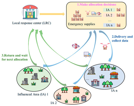 The primary challenge in allocating emergency supplies is to ensure the efficiency, effectiveness, and equity of disaster response in disaster scenarios with uncertainty. This uncertainty primarily refers to the unpredictable demand in IAs because only imperfect information is available in disasters. It is necessary to make multi-period ESA decisions due to the supply and demand of emergency supplies changing over time. Therefore, we propose a multi-period and multi-objective ESA problem with demand uncertainty. The problem is configured with several IAs and a local response center (LRC) for gathering and allocating emergency supplies, as illustrated in Figure 1.