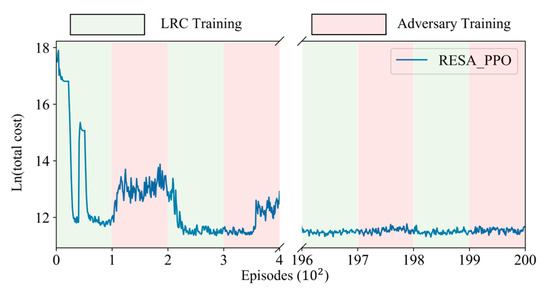 In this section, we evaluate the convergence behavior of RESA_PPO. Referring to [44], we assume that follows a uniform distribution . Without loss of generality, we set and illustrate the convergence curve of RESA_PPO in Figure 7. The green region represents the training phase of the LRC, while the red region indicates the training phase of the adversary.