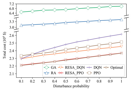 Figure 8 illustrates the mean total cost obtained by RESA_PPO and baselines. Compared with GA and RA, DRL-based approaches deliver substantially better solution quality, and heuristic methods consistently underperform across all experiments. Hence, we do not present the results of the heuristic baseline separately in subsequent experiments. As the disturbance probability increases, both RESA_DQN and RESA_PPO outperform their native counterparts, demonstrating that the RESA framework effectively enhances the robustness of DRL under uncertain demand. Among all methods, RESA_PPO achieves the best performance among the learning-based and heuristic approaches and maintains high stability across all test instances. Although it does not outperform the Optimal baseline, it remains very close to this theoretical upper bound. This demonstrates that RESA_PPO can achieve near-optimal performance even in highly uncertain and dynamic environments.