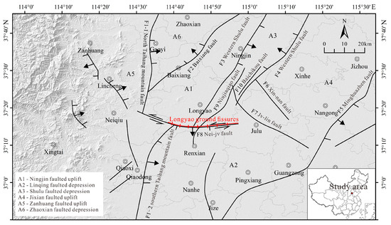 - Peng, J.B.; Xu, J.S.; Ma, R.Y.; Wang, F.Y.; Wang, F. Characteristics and mechanism of the Longyao ground fissure on North China Plain, China. Eng. Geol. 2016, 214, 136–146. [Google Scholar] [CrossRef]