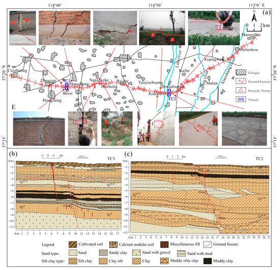 Distribution of the Longyao ground fissure. (a) Ground fissure distribution map; (b) TC1 profile; (c) TC2 profile.