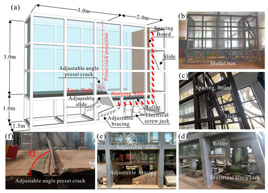 The front and back of the model box are made of transparent tempered glass and a steel frame. The internal dimensions of the model box are 5.0 m × 1.5 m × 3.0 m, of which the hanging wall is 2 m long and the footwall is 3 m long, with a preset crack at the boundary between the hanging and footwall (Figure 3a,b). The bottom of the hanging wall is equipped with a mechanical screw jack with an accuracy of 0.01 mm. A roller row is installed on the top surface of the jack to keep the bottom plate of the model box level. The limit plate of the hanging wall and its parallel adjustable support prevent lateral displacement of the soil when the hanging wall slides (Figure 3c–e). The angle of the preset crack can be adjusted between 60° and 90°, allowing the hanging wall to descend at any angle (Figure 3f). The bottom plate and side plates of the hanging wall can be controlled by the jack to move at a predetermined speed along the preset crack angle, simulating the settlement process of the hanging wall on a normal fault.