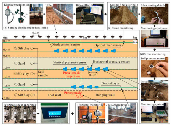 Layout of the monitoring system. (a) Deployment of Monitoring Instruments; (b) surface displacement monitoring; (c) strain monitoring; (d) stress monitoring; (e) graded layer; (f) digital monitoring; (g) direct shear apparatus.