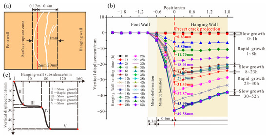Three cracks formed on the surface, with two horizontal cracks on the hanging wall, one of which almost penetrated the top surface, while the other was slightly shorter; a long crack penetrated the top surface and protruded towards the footwall, with the width of the hanging wall and footwall crack zones being 0.4 m and 0.12 m, respectively (Figure 5a). There is no significant change in the vertical displacement of the ground surface outside the footwall range of −0.9 m. There were different degrees of vertical displacement in the range of −0.9 to the hanging wall, forming steep displacement steps. In the range of −0.9 to −0.6 m of the footwall, the vertical displacement was very small, not exceeding 5 mm, which belonged to the micro-deformation zone. In the range of −0.6 m to 0 m, the vertical displacement gradually increased, and cracks and dislocations occurred at 0 m, reaching a maximum displacement of approximately 49.58 mm. The entire hanging wall soil body was significantly deformed, with vertical displacement ranging from 38.04 mm to 47.78 mm, which belongs to the main deformation zone (Figure 5b). Due to the limited size of the model box, the range of the hanging wall micro-deformation zone could not be reflected.