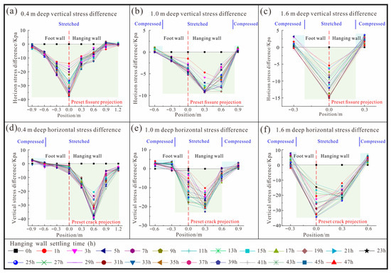 Stress variation characteristics curve. (a) 0.4 m deep vertical stress difference; (b) 1.0 m deep vertical stress difference; (c) 1.6 m deep vertical stress difference; (d) 0.4 m deep horizontal stress difference; (e) 1.0 m deep horizontal stress difference; (f) 1.6 m deep horizontal stress difference.