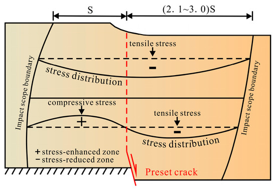 Combining the profile crack diagram (Figure 6) and the stress variation curve diagram (Figure 7), we can effectively explain the stress–strain change law: as the settlement increases, the preset crack tip accumulates the energy required for cracking. After the tip soil cracks, the stress on the hanging wall decreases, but during the hanging wall descent, there is a relative diving speed on the footwall, which changes the stress state in the soil. The deep footwall soil generates compressive stress, forming a stress-enhanced zone, which gradually transforms into tensile stress in the shallow layer, forming a stress-reduced zone (Figure 9). Therefore, the surface soil of the footwall is prone to tensile cracking, but the extension length is limited.