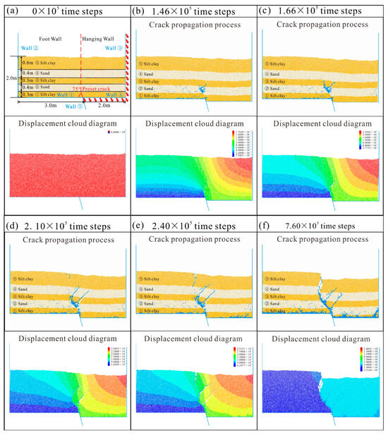 At 1.46 × 105 time steps, when subsidence began, the tips of the preset cracks began to crack and deform (Figure 10b). At 1.66 × 105, the first main anti-dip crack appeared at the tips of the preset cracks, and the surface displacement did not increase significantly. During this stage, the displacement concentration remains largely confined to the vicinity of the preset cracks, with displacement contours progressively densifying toward the hanging wall, while the overall extent of deformation remains limited (Figure 10c). The first main anti-dip crack continued to develop and expand. At 2.10 × 105, the dip cracks at the tips of the preset cracks developed until they were blocked at the bottom of the sand layer, and then secondary anti-dip cracks formed under the pull of the hanging wall soil. The surface displacement of the footwall increases significantly (Figure 10d). The two anti-dip cracks tend to be parallel and have similar lengths. At 2.40 × 105, the surface tensile crack continues to extend downward, and the surface displacement is relatively stable. The high-displacement zone in the displacement cloud diagram expands markedly and propagates toward the hanging wall along the direction of crack growth. The displacement contours become progressively continuous and inclined, indicating the pronounced disturbance of the surrounding soil induced by crack propagation (Figure 10e).
