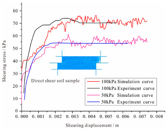 Prior to PFC2D simulations, microscopic particle parameters must be calibrated against macroscopic mechanical properties obtained from geotechnical tests. Numerical models of conventional triaxial and direct shear tests were established, and the simulated stress–strain responses were systematically compared with laboratory results. The microscopic parameters were iteratively adjusted until the numerical curves reproduced the measured macroscopic behavior of the geomaterials. The resulting calibrated microparameters were then adopted for subsequent numerical simulations, ensuring mechanical consistency between the discrete-element model and the physical soil response. Following direct shear tests on the sampled soils (Figure 4g), the shear stress–shear displacement curves obtained from PFC2D simulations were systematically compared with those measured in laboratory direct shear tests. The microscopic parameters were iteratively optimized until close agreement was achieved between the numerical and experimental curves (Figure 11). The final specific values for the simulation particle properties are listed in Table 4.