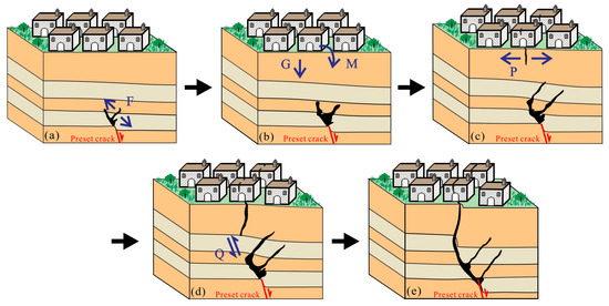The third stage is the development and propagation of near-vertical cracks and anti-dip cracks. As the ‘overhanging surface’ extends, M gradually increases, and an open crack measuring nearly 90° appears on the ground surface. The soil on both sides of the crack undergoes a backward displacement perpendicular to the crack direction, and the crack width gradually increases and extends downward. The top surface is subjected to the maximum circumferential tensile stress P (Figure 12c). The fourth stage is the downward progression and widening of near-vertical and anti-dip cracks. The soil at the bottom of the vertical tensile crack and the top of the preset crack undergoes shear failure, and the shear direction is almost consistent with the preset crack tendency, indicating that the soil is subjected to a shear force Q in the same direction as the preset crack (Figure 12d). The fifth stage is the convergence of near-vertical and normal-dip cracks. The footwall surface crack extends downward and tends to stabilize, forming a wedge-shaped void with the hanging wall anti-dip crack. Under its own weight, it collapsed and closed the anti-dip crack, causing sudden vertical displacement of the ground surface and cracks in houses. The preset crack, shear crack, and vertical tensile crack eventually connected, forming a through crack with an inclination slightly greater than the preset crack, finally completing the upward expansion of the preset crack (Figure 12e).