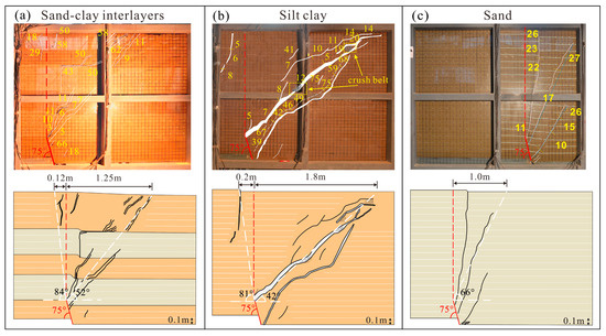 Different soil types affect the propagation trend of cracks. The crack propagation patterns of buried cracks with the same preset crack angle and settlement velocity in sand-clay interlayers, silty clay, and sand are compared (Figure 13). The width and angle of deformation zones in different soil types are shown in Table 5. In condition 2, the angle of the hanging wall crack zone was relatively small at about 42° (Figure 13b), while in condition 3, it was relatively large at about 66° (Figure 13c). Condition 1 was between the two at about 52° (Figure 13a). The angle of the footwall crack is large and inclined towards the footwall, extending to a limited depth inside the soil. No cracking occurred in the footwall under condition 3. Vertical tensile cracking occurred at a settlement of 5 mm under condition 2, with the fastest speed. It occurred at a settlement of about 22 mm under condition 3, with a slower speed, and at a settlement of about 18 mm under condition 1, with a moderate speed. Regardless of the soil type, the expansion of the crack will cause anti-dip cracking in the hanging wall. In condition 2, the anti-dip crack angle was small, the deformation zone was wide, and the degree of fragmentation was high. In condition 3, the anti-dip crack angle was large, the deformation zone was narrow, and the degree of fragmentation was low. The cracking in condition 1 was between that in conditions 2 and 3, and when the crack expanded upward, it turned at the sand–soil interface with a significant change in angle. In general, the anti-dip crack angle, influence zone width, and soil fragmentation degree of sand–clay interlayers are between those of silt clay and sand.
