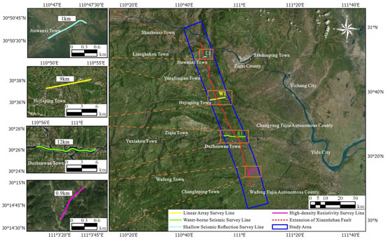 The Xiannüshan Fault Zone is located in the southwestern part of the Huangling Anticline. Composed of several faults striking NW 340–350° (nearly north–south), it has a total length of approximately 90 km and is one of the largest and most structurally complex active faults in the Three Gorges Reservoir Area. Early studies divided the Xiannüshan Fault Zone into three segments: the northern segment (Xiannüshan Fault in the narrow sense), the middle segment (Duzhenwan Fault), and the southern segment (Qiaogou Fault) [1,2]. In recent years, enhanced microseismic activity around the Xiannüshan Fault Zone has drawn considerable attention to the relationship between this fault and local seismicity. However, previous investigations have mainly concentrated on the northern segment of the Xiannüshan Fault Zone, addressing the northward extension of the fault across the Yangtze River [3,4], reservoir-induced seismicity and associated geological hazards (e.g., landslides and collapses) [5,6,7,8], as well as analyses of fault gouge materials [9,10]. Relatively few studies have examined the deep and shallow structure at the northern end of the fault or the activity of the middle and southern segments, leaving a gap in the regional seismic hazard knowledge. Therefore, investigating the fault characteristics and tectonic development of the Xiannüshan Fault Zone is particularly important for regional earthquake preparedness and mitigation.