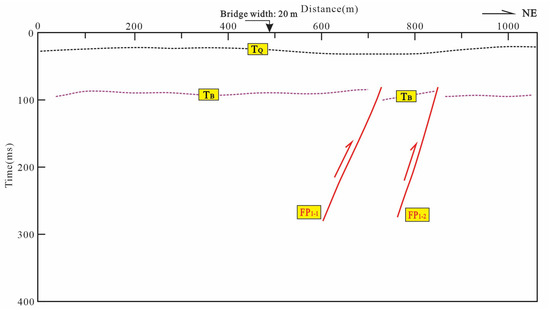 The seismic reflection profile of the L1 survey line is shown in Figure 3, while the corresponding interpreted profile is presented in Figure 4. Based on the reflection characteristics in Figure 3, a strong and continuous reflection corresponding to the base of the Cenozoic (labeled TQ) is clearly identifiable from 0 m to 1500 m along the profile. Beyond 1500 m, the reflections become disorganized, consistent with field observations of bedrock outcrops at the surface. Beneath the TQ horizon, a distinct bedrock reflector (labeled TB) is present; however, in the zone beyond 1500 m, the TB reflections are somewhat disrupted due to exposed bedrock. As illustrated in Figure 4, the TB reflector is vertically offset at approximately 990 m (two-way travel time 83.5 ms) and again at 1116 m (two-way travel time 91 ms) along the line, corresponding to interpreted fault breakpoints FP1-1 and FP1-2, respectively. Comprehensive analysis indicates that Fault F1-1 is a west-dipping thrust fault at FP1-1, displacing the TB horizon, with its upper breakpoint located at a depth of about 90.5 m. Likewise, Fault F1-2 is a west-dipping thrust fault at FP1-2, offsetting the TB horizon with an upper breakpoint at a depth of approximately 107.2 m. Neither fault offsets the TQ horizon near the surface; both terminate within the TB horizon and do not cut the base of the Quaternary deposits.