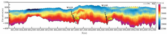 We deployed one microtremor array line (W1) in a key part of the middle segment of the Xiannüshan Fault where a vibroseis truck could not be used. The microtremor survey identified two fault-related anomalies (FP4-1 and FP4-2). Figure 9 shows the shear-wave velocity profile inverted from the microtremor data along line W1. Between horizontal positions 484,113 and 484,966 (in local coordinates), a low-velocity anomaly appears above 100 m depth, with shear velocities around 1605–1850 m/s. Field reconnaissance revealed that this section of the line lies near the Changyang High-Speed Railway Station and runs adjacent to the railway tracks. The high-frequency vibrations from passing trains have likely lowered the measured near-surface velocities and obscured low-frequency (deep-penetrating) signals, resulting in a shallower effective inversion depth in this area. Further along W1, near station W1125 (horizontal coordinate 486,440–487,340), the apparent shear-wave velocity of bedrock decreases laterally, indicating a discontinuity. We interpret a fault F4-1 here in Figure 10, expressed as a thrust fault dipping east. The upper portion of the fault is nearly vertical, and comprehensive analysis suggests this is the main fault of the Xiannüshan Fault Zone in this area. Near station W1192 (coordinate 488,750–489,000), another lateral velocity discontinuity is observed, with higher velocities on the east side. This is inferred to be Fault F4-2, a near-vertical, high-angle thrust fault dipping east. Analysis suggests that F4-2 is a secondary fault within the Xiannüshan Fault Zone.