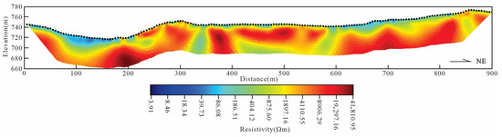 The high-density resistivity method is essentially an array-based electrical prospecting technique based on resistivity contrasts between rock and soil. By analyzing the distribution pattern of conduction currents in the subsurface when an electric field is applied, the method determines subsurface geological structures [48,49].