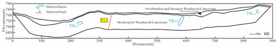 The inversion resistivity section of line GD2 is shown in Figure 11, while the corresponding integrated geological profile is presented in Figure 12. According to the inversion results, the effective inversion depth of line GD2 is approximately 80 m. Based on existing geological data, geological information can be assigned to the apparent resistivity section as follows: (1) The surface layer mainly consists of completely and strongly weathered limestone, with a few intermontane valleys covered by Quaternary deposits, exhibiting low apparent resistivity. The underlying bedrock is moderately weathered limestone, generally showing relatively high resistivity with values greater than 1500 Ω·m. (2) At distances of approximately 50 m, 315 m, and 670 m from the starting point of the survey line, zones of low apparent resistivity are observed, which are interpreted as three karst anomalies (YR2-1, YR2-2, and YR2-3). (3) At approximately 570 m from the starting point in Figure 11, the apparent resistivity displays a low-resistivity anomaly flanked by high-resistivity zones. As illustrated in Figure 12, this feature is interpreted as a fault (F5-2) dipping westward, with the upper fault point buried at a depth of approximately 15 m. This fault point is located along the strike direction of the southern segment of the Xiannüshan Fault.