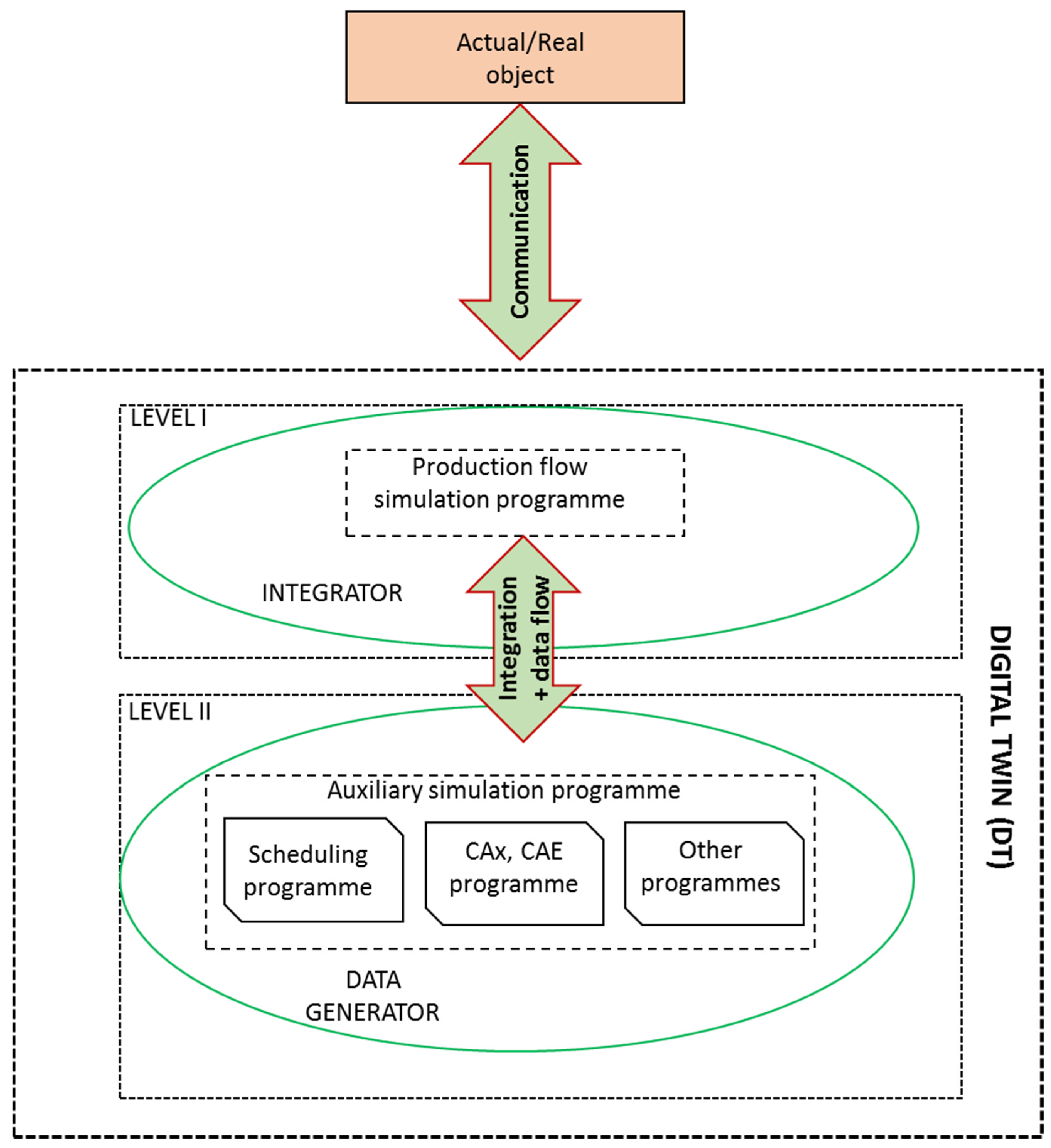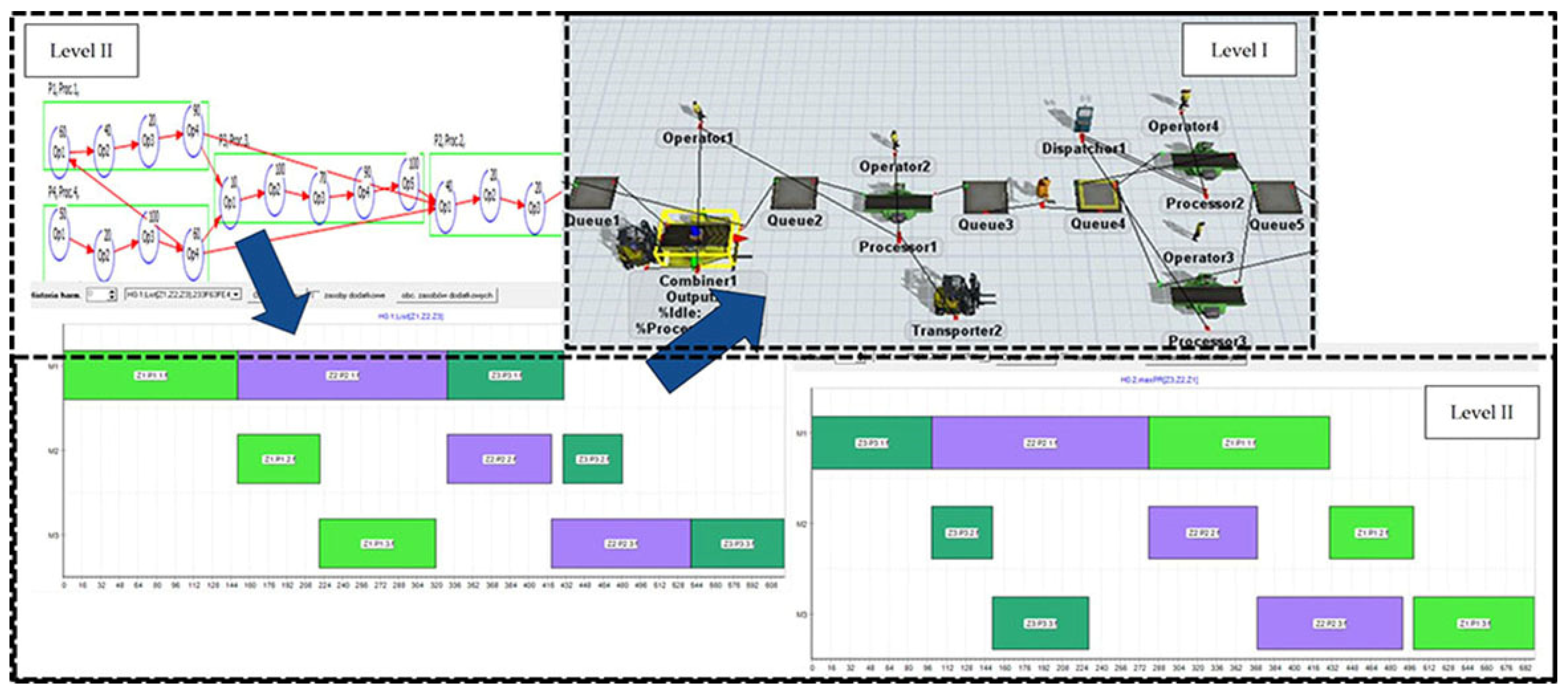 - Level I—simulation tool (FlexSim): Simulation of production, transportation, assembly, and internal logistics flows using data from Level II.