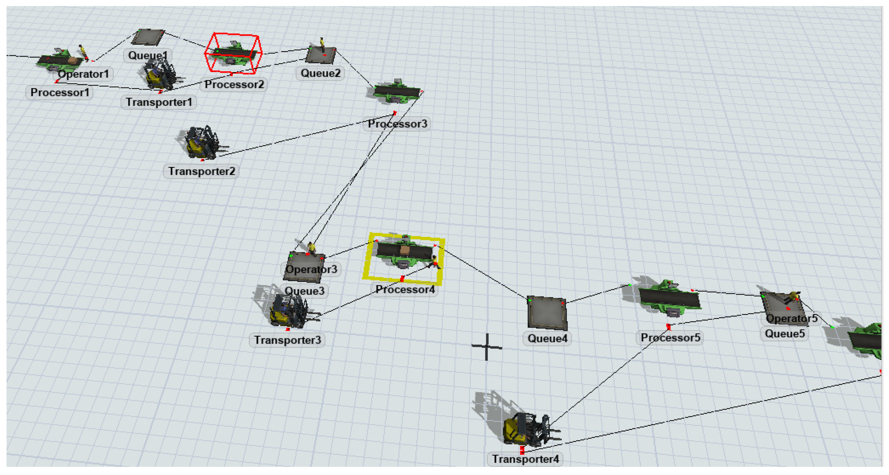 - Scenario 1—The problem was that the truck either did not reach a specific machine or did not reach it at all. In this scenario, additional interlocks and controls were introduced to minimize the number of trucks that did not reach a specific machine. Signal amplification was also implemented to prevent the truck’s signal from being lost in the hall. The results obtained for the Cmax completion time were 461 min.
