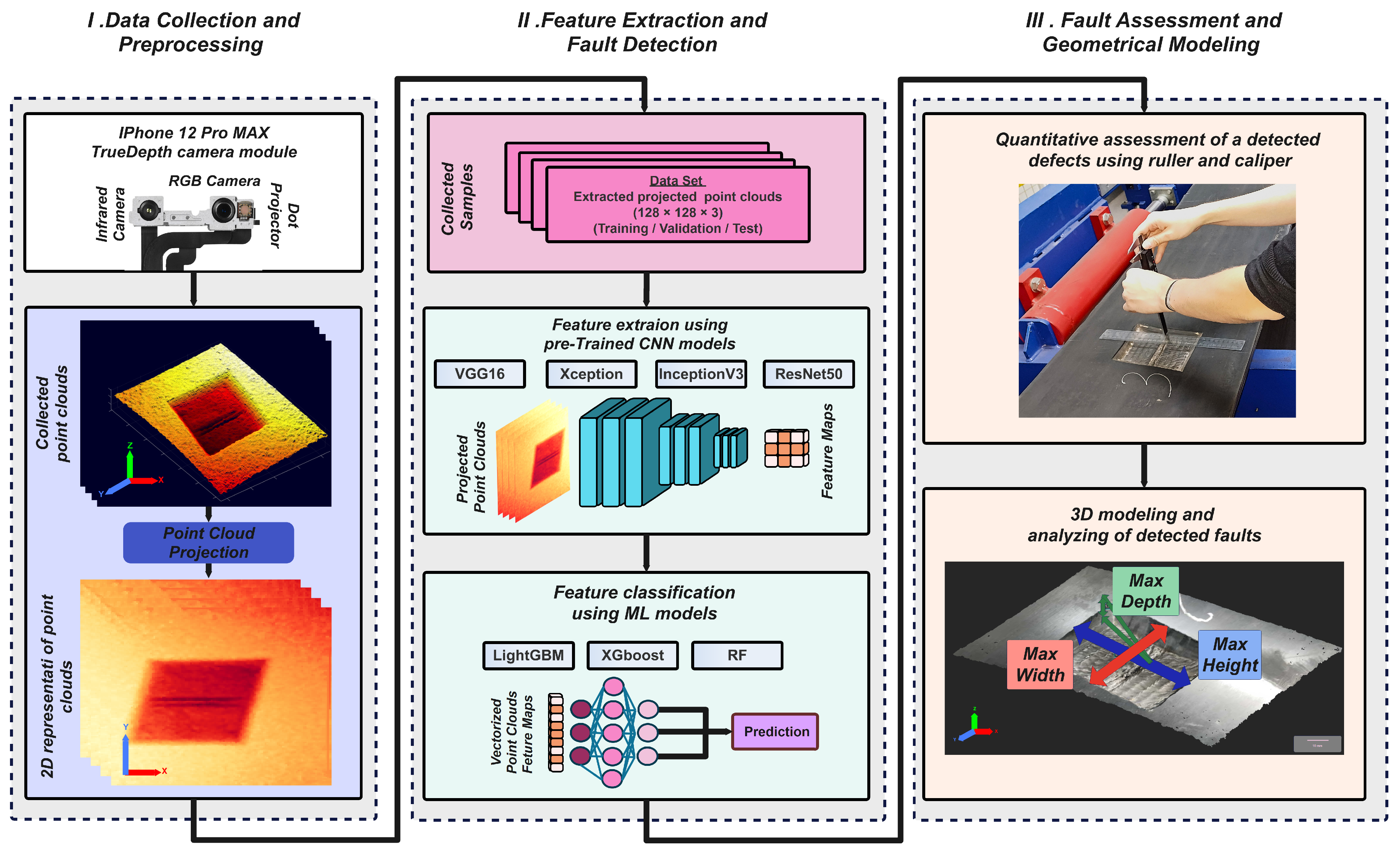 Figure 1, begins with the acquisition of 3D point cloud data using the integrated TrueDepth camera of an iPhone 12 Pro Max. A critical preprocessing step involves transforming the raw 3D point clouds into 2D feature projections. This transformation is essential to reduce computational complexity and to leverage pre-trained 2D CNNs for effective feature extraction. Subsequently, a hybrid framework is introduced, where deep features extracted from the 2D point cloud projections are classified using traditional machine learning models. The procedures for training and evaluating these models are detailed to identify the optimal CNN and classifier pair for defect detection.