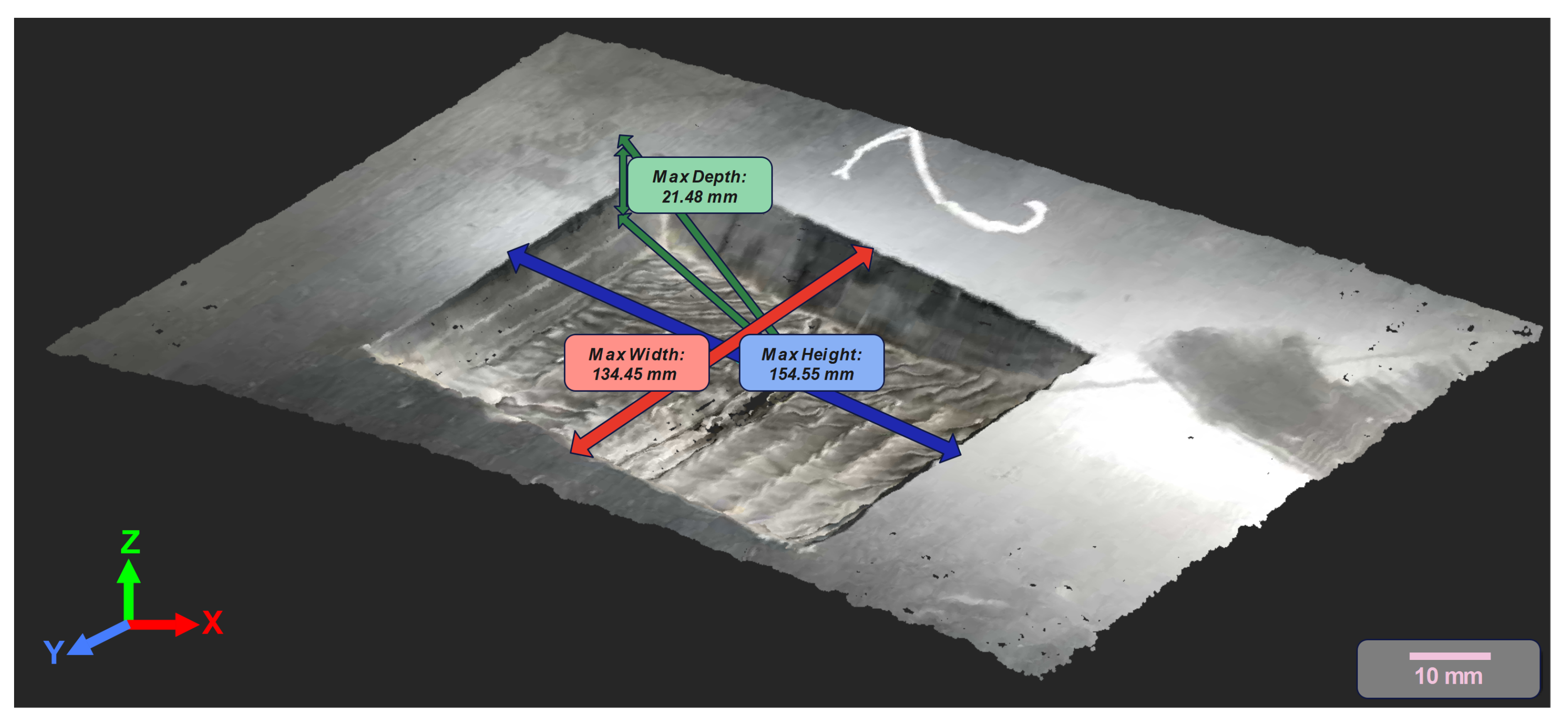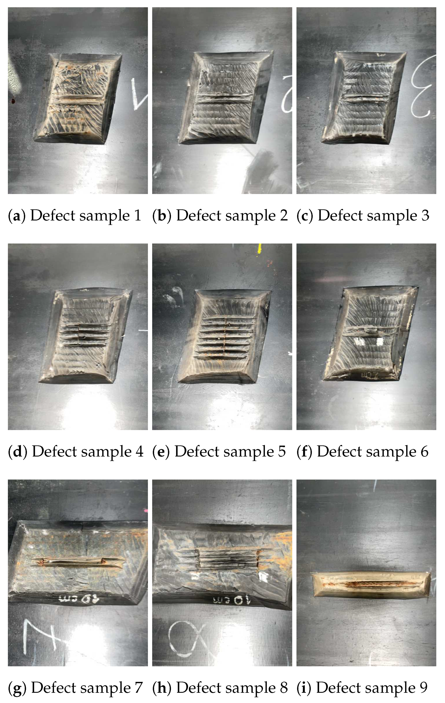 58]. For validation purposes, manual measurements of maximum depth, width, and height for each defect were collected using precision rulers and calipers (see