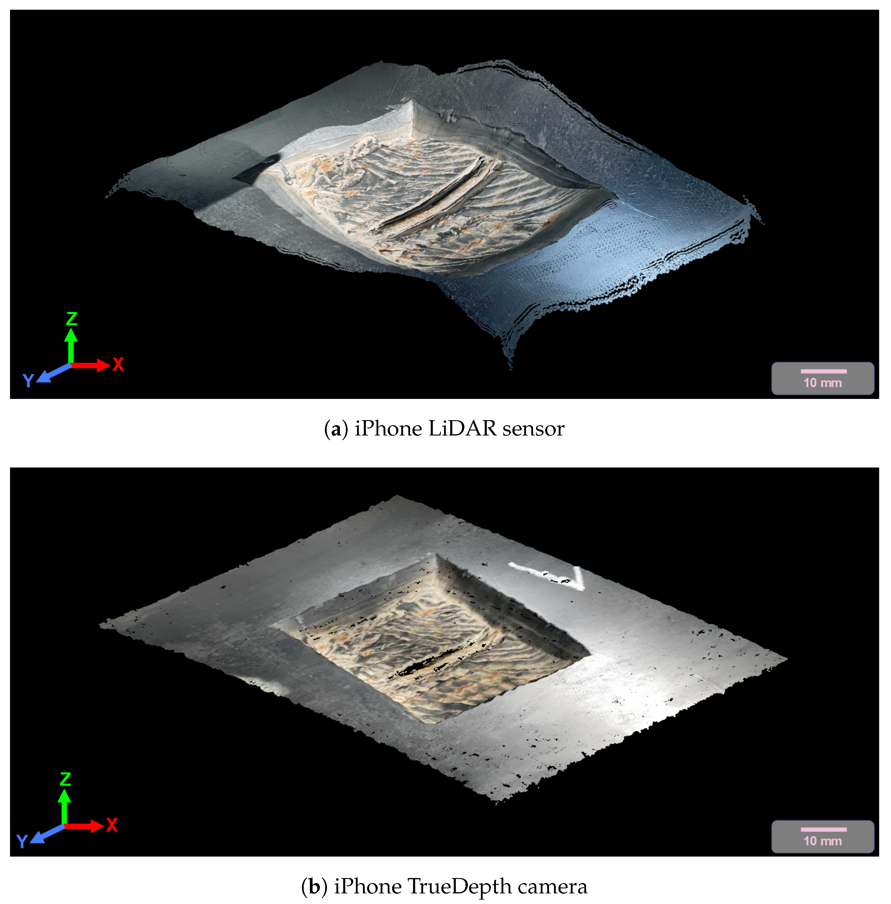 Figure 6, which compares the LiDAR and TrueDepth camera in capturing point clouds from an exemplary conveyor belt defect, the iPhone LiDAR shows limitations in accurately reproducing the defect’s geometrical features. In contrast, the TrueDepth camera captures precise point clouds that enable accurate depth measurement of the surface defects. The main reason behind the poor performance of the LiDAR sensor is the fact that the LiDAR module in the iPhone 12 Pro Max is specially designed for distance estimation rather than precise point cloud generation. Therefore, although it can work better with geometrical features at longer distances in comparison to the TrueDepth camera, it has a poor performance in capturing precise point cloud data at short distances, as was the intention of this case study.