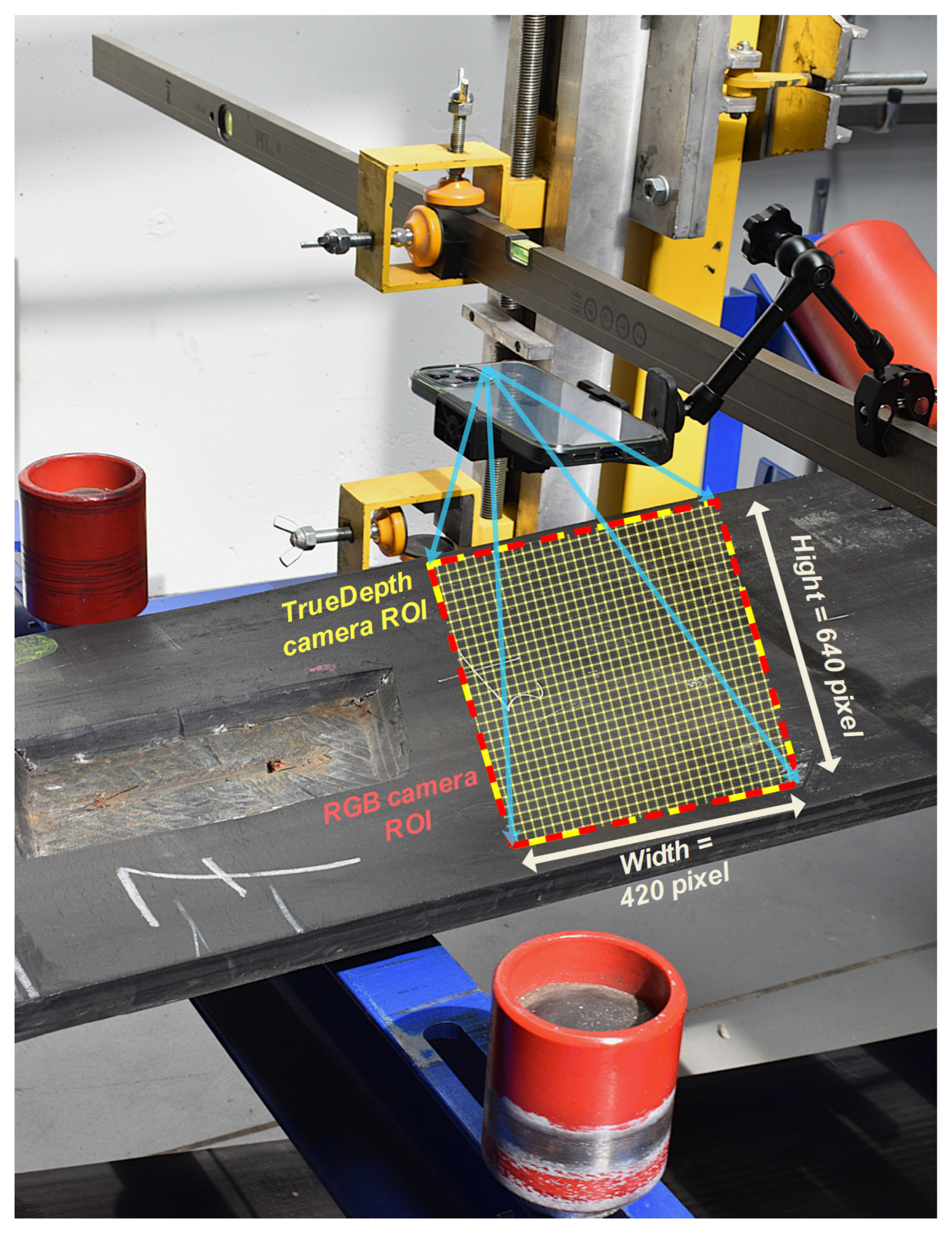 74]. During experiments, the smartphone was positioned approximately 250 mm above the belt surface to capture samples. The TrueDepth camera operated at a frame rate of 30 frames per second, with each frame generating a corresponding point cloud. A rectangular region of interest (ROI) measuring 25 cm in width and 35 cm in height was continuously recorded from the central section of the belt. Each TrueDepth frame generated a point cloud containing 273,674 individual points (see