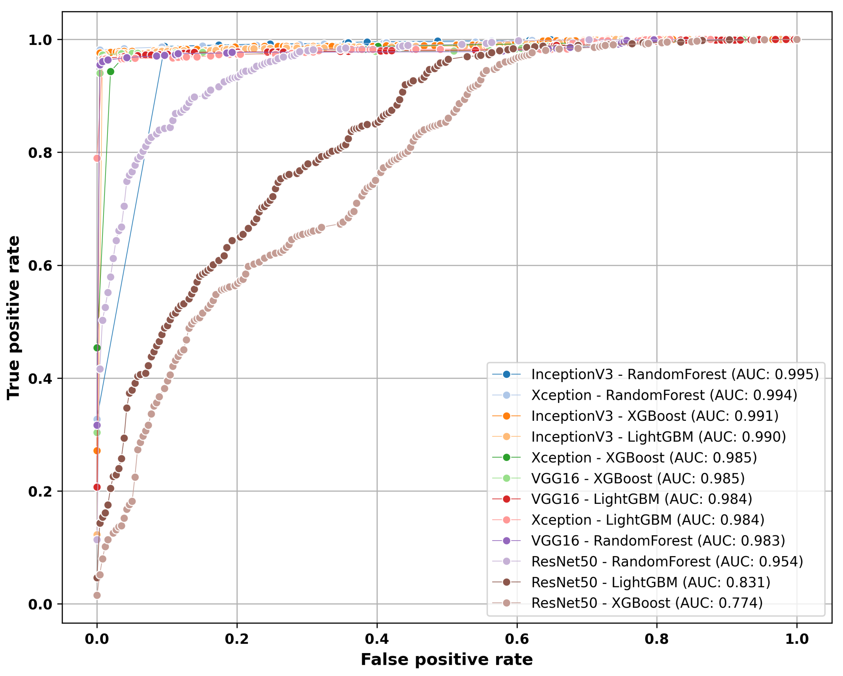 Figure 10 summarize the performance of models trained on TrueDepth-derived data. The models using 3D geometric features exhibit strong and consistent discriminative power, with curves rising sharply toward the top-left corner and area under the curve (AUC) values exceeding 0.98 across classifiers. These results indicate that features extracted from TrueDepth point clouds provide a robust and separable representation of defects, enabling high true positive rates with low false alarm rates across different model–classifier combinations. The consistency of ROC behaviour across architectures suggests that the projected point cloud representation delivers classifier-agnostic signal quality suitable for reliable defect detection in challenging environments.