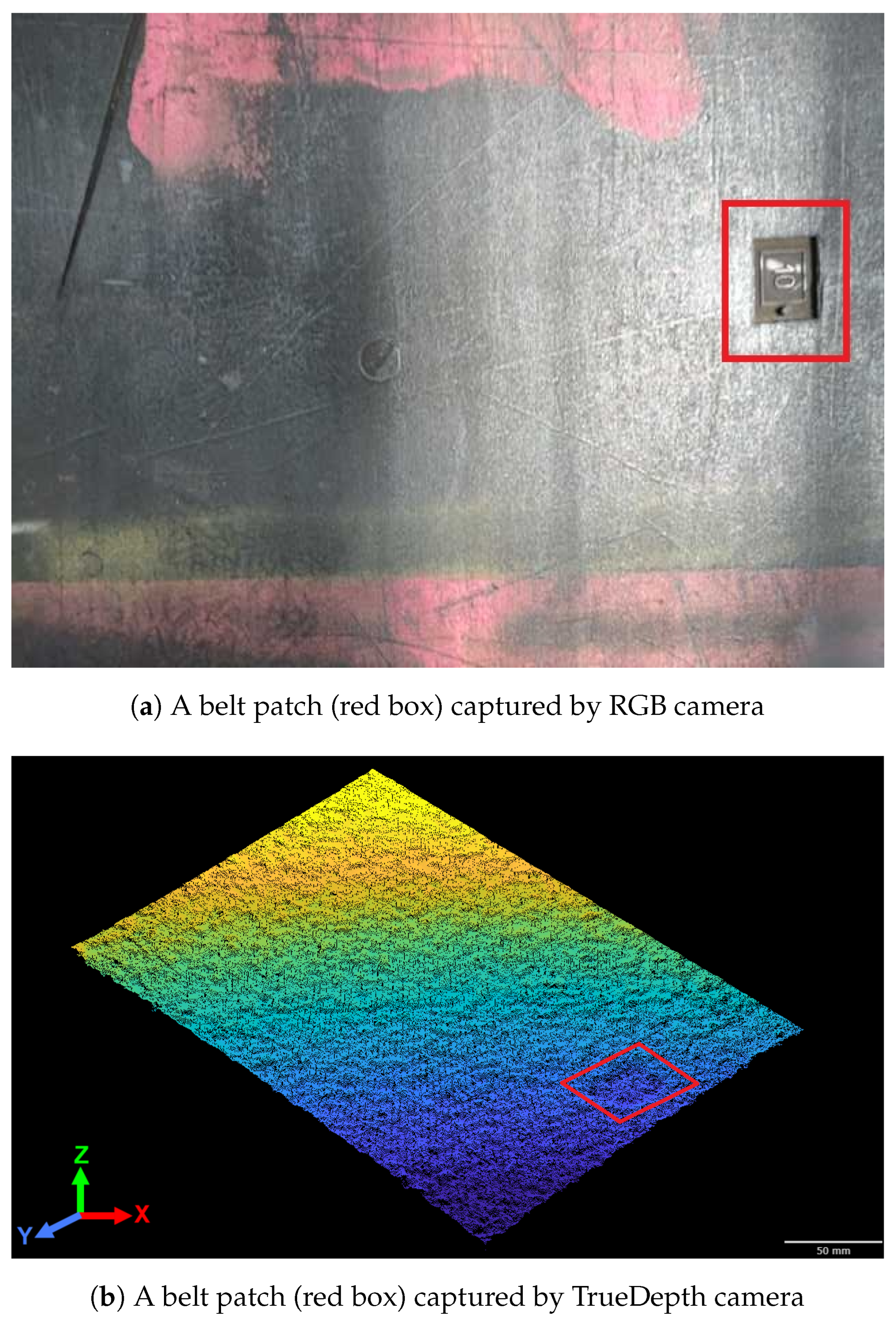 The simulated damage profile includes situations such as deep gouges and cuts that partially expose the underlying steel cord reinforcement. These defects are mainly characterized by localized geometric changes on the belt’s surface. The proposed method uses these geometric indicators, specifically point clouds from a TrueDepth camera, to provide precise, quantitative measurements of 3D surface changes. This approach allows for reliable defect detection based solely on measurable geometric anomalies, maintaining accuracy regardless of lighting conditions or surface contamination.