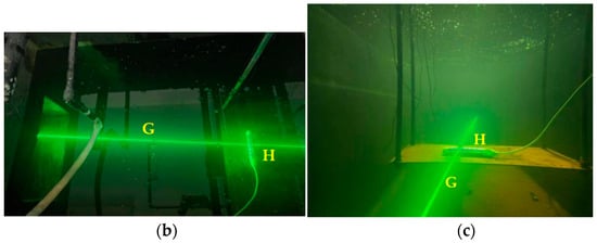 To simulate the actual water conditions in open seas and coastal waters, experiments were performed in environments with turbidities of 0.04 NTU and 0.06 NTU, respectively. A schematic of the experimental setup is shown in Figure 2, which includes a 532 nm laser, a backscattering optical receiver, a photoelectric signal conversion and processing module, a heating rod, a digital controller, a computer, and a water tank. The experiments were conducted in an 18 m (L) × 2 m (W) × 1.5 m (H) water tank. A solid-state laser operating at 532 nm with a pulse width of 8–12 ns was employed. The laser was equipped with a 0.2 mm output aperture and featured an adjustable focal length (10–60 mm), a beam divergence of 1–2 mrad, a tunable repetition rate (10–1000 Hz), and adjustable output energy (5–20 mJ). For this experiment, specific settings were fixed at a 10 ns pulse width, a 10 mm focal length, a 1 mrad beam divergence, and a 1000 Hz repetition rate. The chosen focal length yields a small detection acceptance angle of 1.146°, which helps suppress stray light and allows for more accurate measurement of turbulence-induced signal fluctuations. The polarization state and repetition rate of the laser exhibit no significant effect on measurements under turbulent conditions. The laser used in this study is non-polarized, and no polarizing elements are employed in the experimental setup. Polarization state is therefore not a focus of this work. From the perspective of statistical optics and turbulence propagation theory, the laser repetition rate is not a physical parameter that governs the statistical characteristics of turbulence effects; it primarily influences the sampling density and convergence speed of statistical estimation. In the experiments conducted in this study, the measurement duration was sufficiently long, and the sampling satisfied the signal reconstruction conditions. Therefore, the use of a laser frequency of 1000 Hz does not affect the statistical essence of the turbulence effects. In summary, under the theoretical and experimental framework of this study, laser polarization and repetition rate do not affect the statistical essence of turbulence effects and can therefore be reasonably neglected as non-critical parameters in analysis and modeling. The transceiver system employs an off-axis design to prevent detection errors caused by near-field strong scattering echo saturation and far-field excessively weak echo signals, respectively. The echo signal amplitude was measured using a photoelectric conversion and processing module with a response wavelength range of 300–650 nm and a sensitivity of 110 mA/W. The module’s gain was voltage-controlled, reaching a maximum of . Meanwhile, localized temperature gradients were generated in the water tank by heating rods to induce thermal turbulence. The induced temperature difference in the water body was maintained at approximately 2 °C per cycle, with fluctuations kept within ±0.1 °C. The procedure began with the continuous acquisition of backscattered signal amplitudes via a digital acquisition unit. Following this, the SI was computed using Equation (2) to generate the measured dataset. This dataset was then subjected to a fitting analysis with the theoretical model to quantify the model’s performance in capturing the statistical characteristics of underwater optical transmission. A photograph of the experimental setup is shown in Figure 3, with the components labeled as follows: A: Backscattered light receiver optic, B: laser, C: Digital processing system, D: Photoelectric signal conversion and processing unit, E: Computer, F: Optical transmission window, G: Laser transmission channel, H: Immersion heater. In Figure 2, the parameter represents the single-pass propagation distance of the laser in the aqueous medium, while denotes the distance between the turbulence region and the transmitter. Figure 3a shows a schematic diagram of the constructed experimental system, while Figure 3b,c depict the actual detection scenarios in underwater environments with turbidity levels of 0.04 NTU and 0.06 NTU, respectively. The size of the suspended particulate matter used in the experiments ranges from 20 to 200 μm.