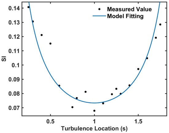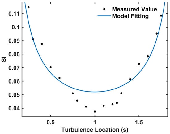 As shown in Figure 7, the SI in the 0.06 NTU aqueous environment maintains a non-monotonic trend, characterized by an initial decrease followed by an increase. Compared with Figure 5, the SI in Figure 7 exhibits more subdued changes across both decreasing and increasing phases, indicating that while higher turbidity preserves the overall trend, it moderates the rate of these fluctuations. Furthermore, the SI values are systematically lower across all positions. The observed phenomenon is primarily attributed to intensified multiple scattering from suspended particles under elevated turbidity, which degrades the beam’s spatial coherence. This degradation subsequently suppresses the contribution of temperature-induced refractive index fluctuations to intensity variations, thereby mitigating the scintillation effect and ultimately reducing the SI values.