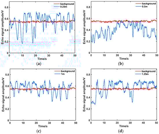To better simulate the open-sea optical transmission environment, the experiment was conducted in a water medium with a turbidity of 0.04 NTU, and the experimental setup is shown in Figure 3b. A baseline was established by first measuring the backscattered echo amplitude in turbulence-free water using a digital acquisition unit. Echo signals under various turbulence locations—characterized by different temperature gradients—were then systematically collected to build the quantitative model relating turbulence location to the SI. The heating rod was systematically displaced along the beam path within a 2 m range from the laser transmitter, effectively shifting the axial position of the turbulence zone. This enabled the acquisition of echo signal amplitude data at various positions within the turbulent region, relative to the laser transmitter, with representative samples shown in Figure 4.