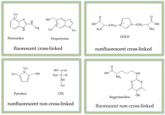 In addition, the autoxidation of glucose, the oxidative cleavage of Schiff bases and lipid peroxidation can produce dicarbonyl compounds that cause the formation of AGEs. Furthermore, glycation has been shown to contribute to oxidative stress as AGEs interact with their receptor (RAGE), leading to increased production of reactive oxygen species (ROS) that accelerate AGE formation. Consequently, under hyperglycemic conditions and in a state of oxidative stress, there is a disruption of the spatial organization of biomolecules, aggregation, and the development of glycation-related diseases. To date, more than 20 types of AGEs have been identified. The classification of these compounds is primarily based on two structural criteria: their ability to emit fluorescence and their capacity to form intermolecular cross-links between proteins. According to these structural properties, AGEs are categorized into four groups: (i) non-cross-linked, non-fluorescent; (ii) cross-linked, non-fluorescent; (iii) non-cross-linked, fluorescent; and (iv) cross-linked, fluorescent. Fluorescent cross-linked AGEs, such as pentosidine, are often used as biomarkers for cumulative glycation damage. In contrast, non-fluorescent cross-linked AGEs, like glucosepane, represent a significant portion of the modifications found in long-lived tissues like collagen. Furthermore, non-cross-linking AGEs, such as Nε-(carboxymethyl)lysine (CML) and Nε-(carboxyethyl)lysine (CEL), serve as key indicators of oxidative stress. Understanding these differences provides a good basis for measuring total AGEs [20,21] (Figure 3). In experimental practice, these compounds serve as critical markers: pentosidine is used to assess cumulative damage, while CML is the primary diagnostic indicator for oxidative-mediated glycation.