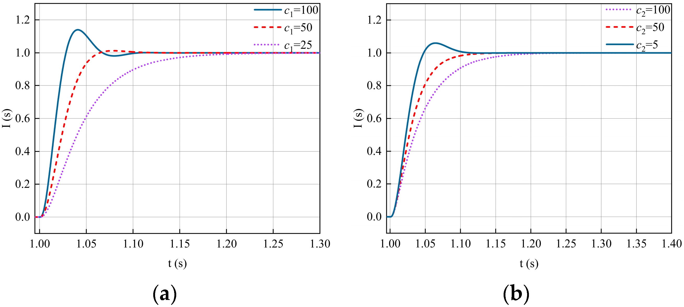 c2 on the system dynamic performance under different values are further analyzed. Both parameters are positive design coefficients used to balance the weighting between the state variable term and the fractional-order dynamic term in the sliding surface, where