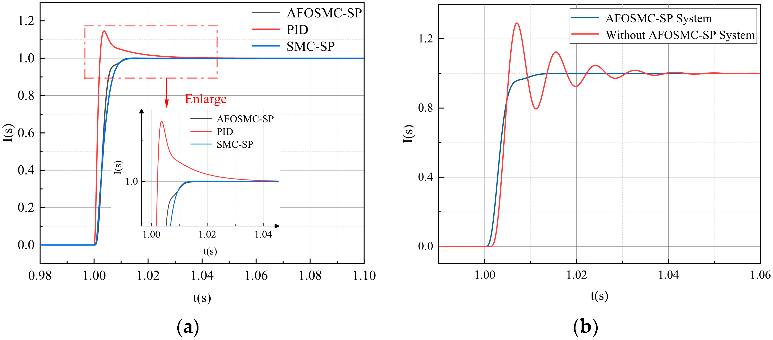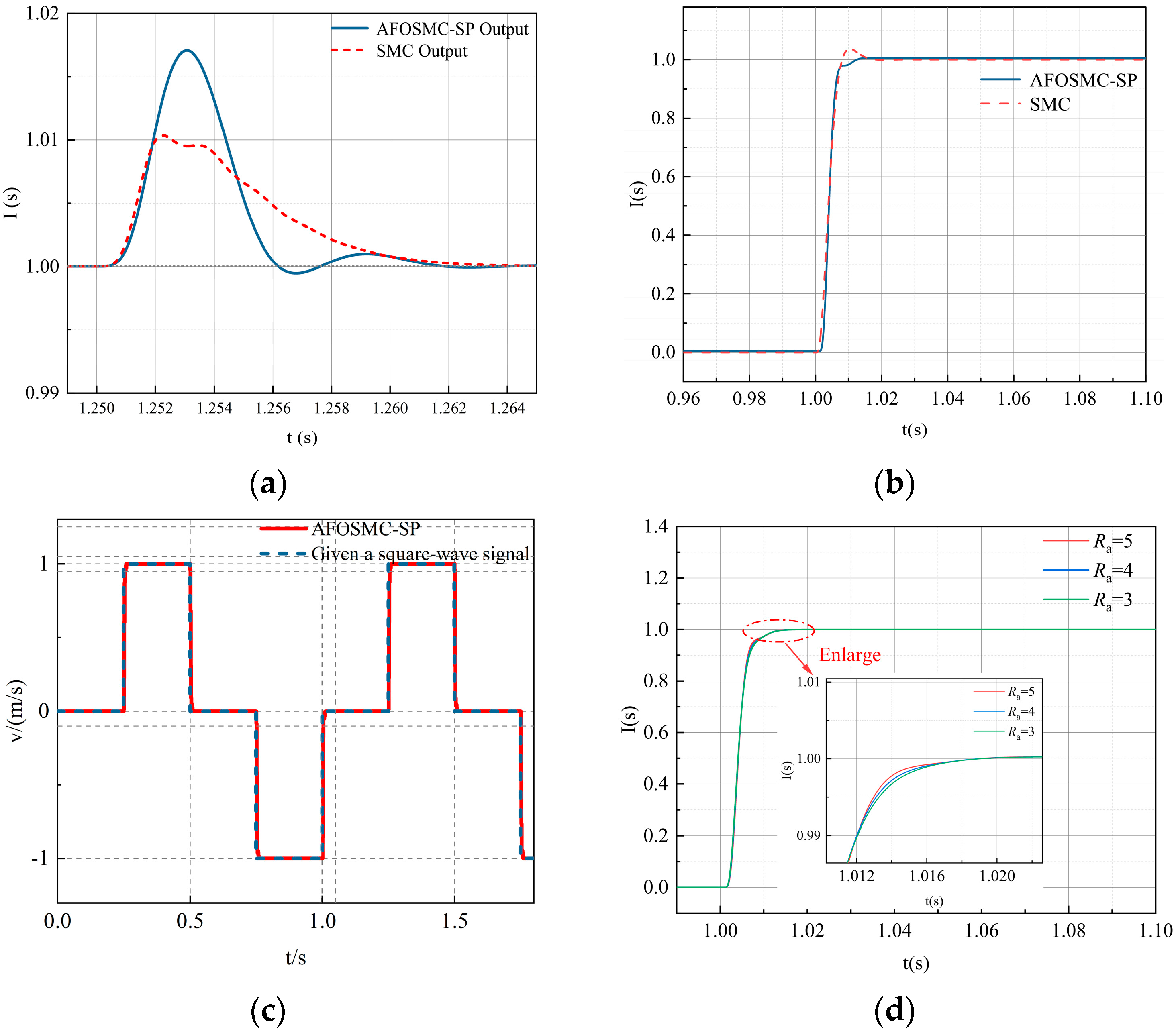 Figure 6a compares the output characteristics of SMC, PID, and AFOSMC-SP during the system’s rising phase and oscillation process. With adaptive sliding mode control, the system exhibits an overshoot of 0.85% and reaches steady state in about 42 ms. In contrast, the improved fractional-order sliding mode control reduces overshoot to 0.025% and shortens the steady-state time to approximately 8 ms. The PID control strategy shows notably poorer overshoot and response time compared to the other two methods. These results demonstrate that the improved fractional-order sliding mode control effectively suppresses chattering while significantly enhancing system performance, making it highly suitable for control applications demanding high precision, rapid response, and strong robustness. As shown in