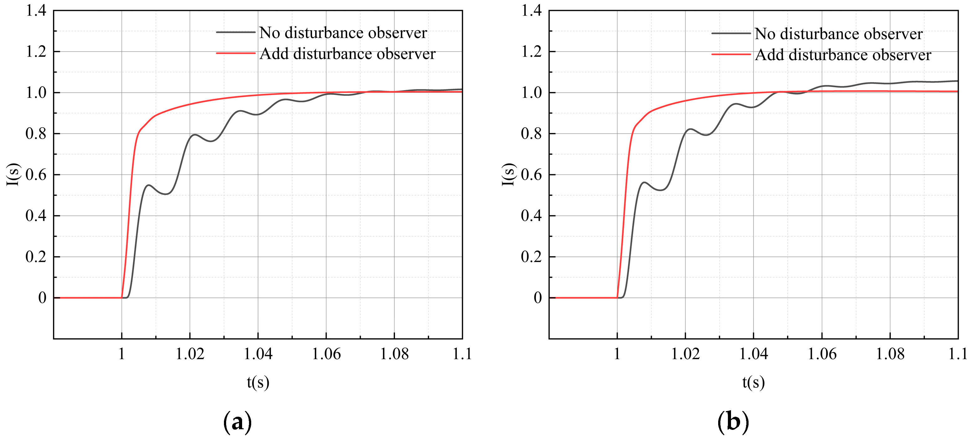 Figure 8b compares the output response of the disturbance observer after compensating for larger force disturbances with the output response of the system without a disturbance observer. From the figure, it can be seen that the disturbance observer can effectively compensate for the impact of external force disturbances on the system after being subjected to different magnitudes of disturbance forces, enabling the system to maintain stable output and good dynamic characteristics even under external disturbances.