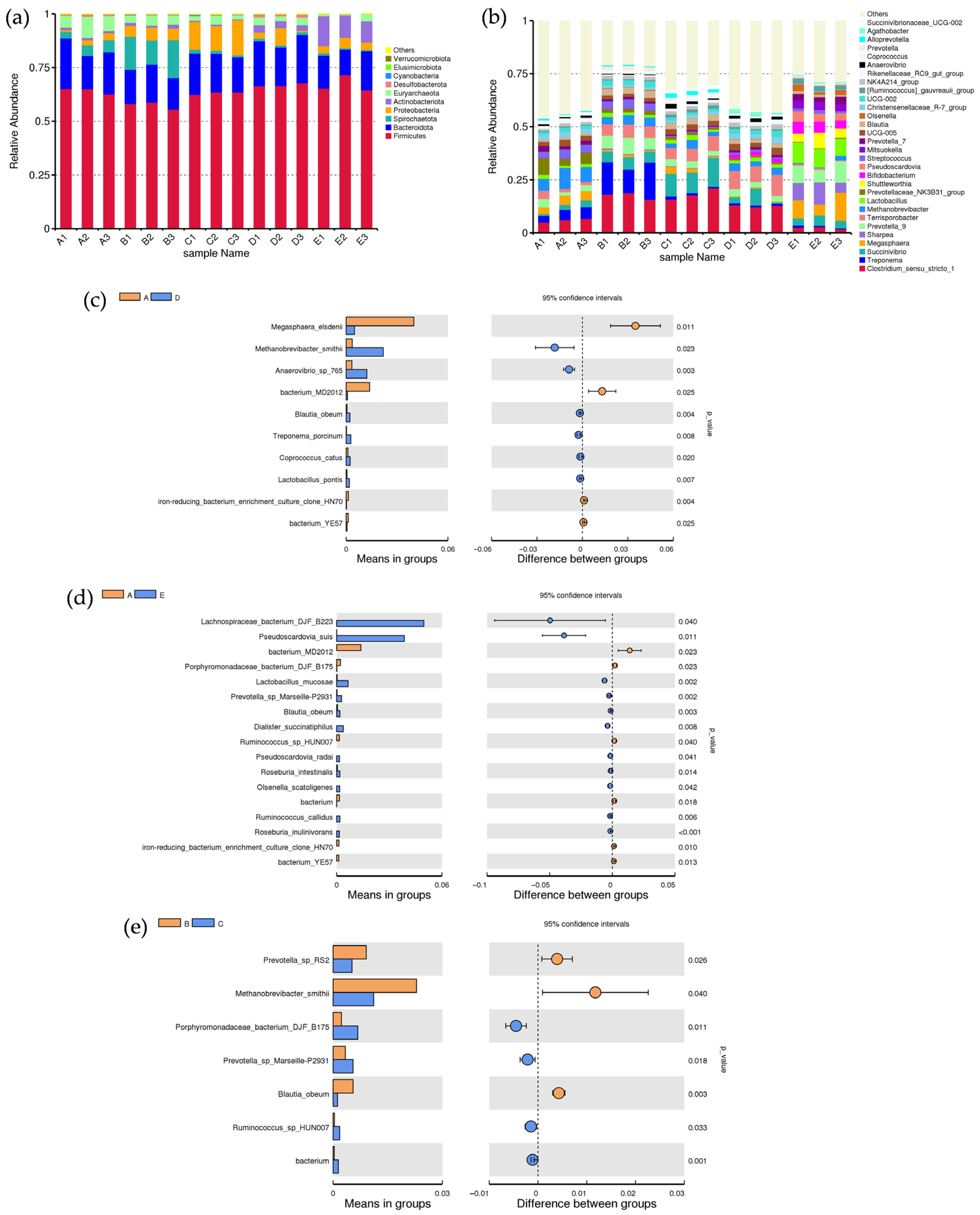 - Tang, Q.; Yin, X.; Wen, G.; Luo, Z.; Zhang, L.; Tan, S. Unraveling the composition and function of pig gut microbiome from metagenomics. Anim. Microbiome 2025, 7, 60. [Google Scholar] [CrossRef] [PubMed]