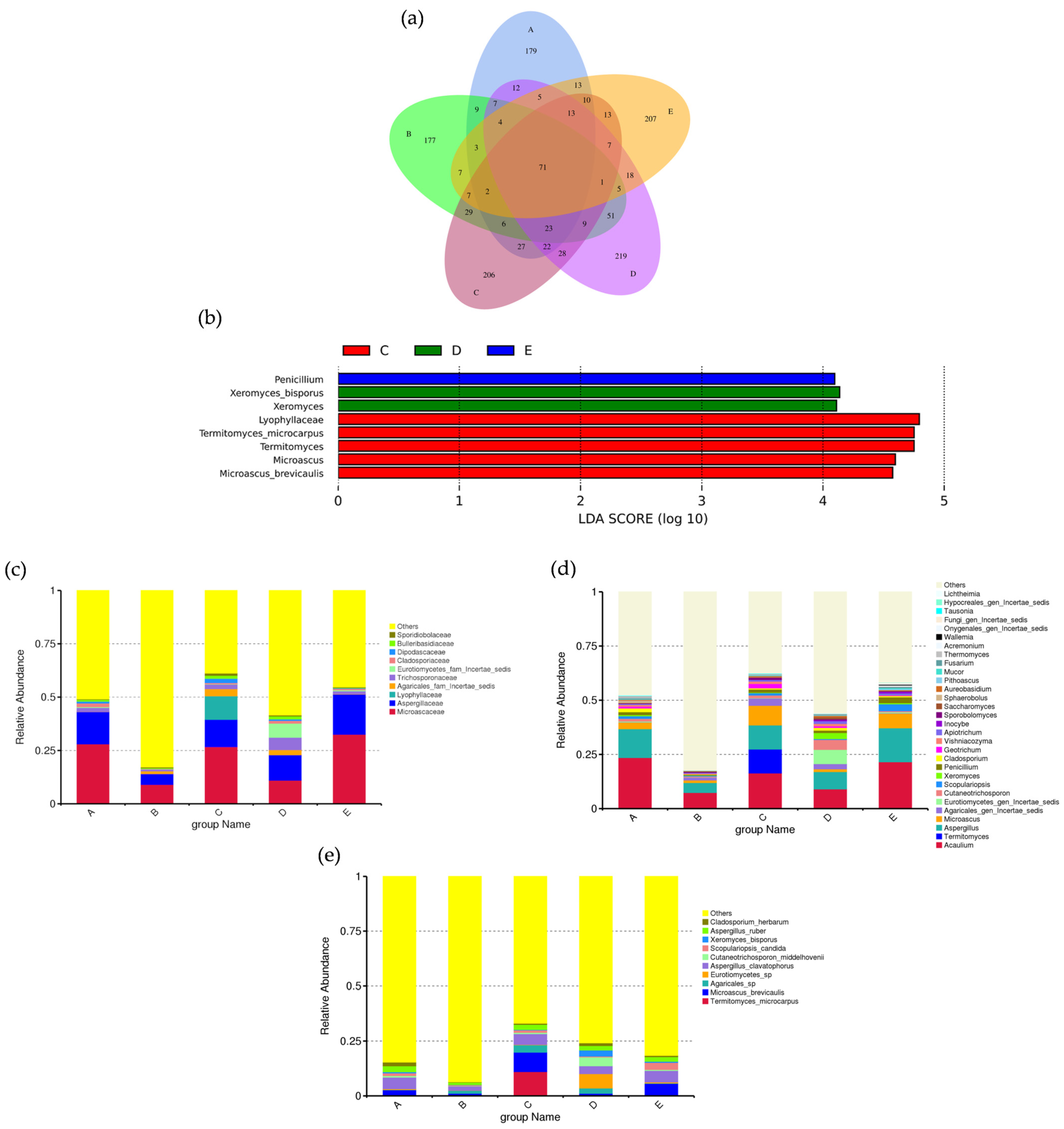 - Abarenkov, K.; Nilsson, R.H.; Larsson, K.H.; Taylor, A.F.S.; May, T.W.; Frøslev, T.G.; Pawlowska, J.; Lindahl, B.; Põldmaa, K.; Truong, C.; et al. The UNITE database for molecular identification and taxonomic communication of fungi and other eukaryotes: Sequences, taxa and classifications reconsidered. Nucleic Acids Res. 2024, 52, D791–D797. [Google Scholar] [CrossRef] [PubMed]