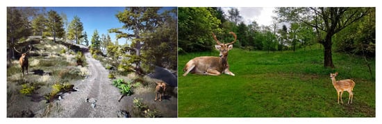 Exploration (Low cognitive load)—Free exploration of the virtual forest. Objects reacted contingently to gaze (e.g., the deer approached, rabbits moved, flowers grew). This phase required basic visual attention and allowed familiarization with gaze-based interaction.