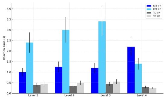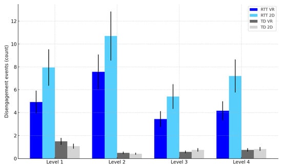 As task complexity increased, performance declined across both groups, confirming the task complexity hypothesis. However, this decline was steeper for the RTT group, consistent with prior evidence that higher cognitive load exacerbates attentional disengagement in RTT [6,13]. Nonetheless, the presence of a significant VR benefit even at the highest task levels suggests that immersive interfaces may support cognitive engagement beyond the limits typically observed in this population.