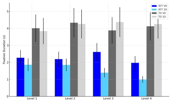 - Modality effect (2D vs. VR): Both RTT and TD participants will show higher levels of attentional engagement and faster visual exploration in the VR condition compared to the 2D condition, due to greater immersiveness and ecological validity of VR environments [32,33,34,38,39,40,41].