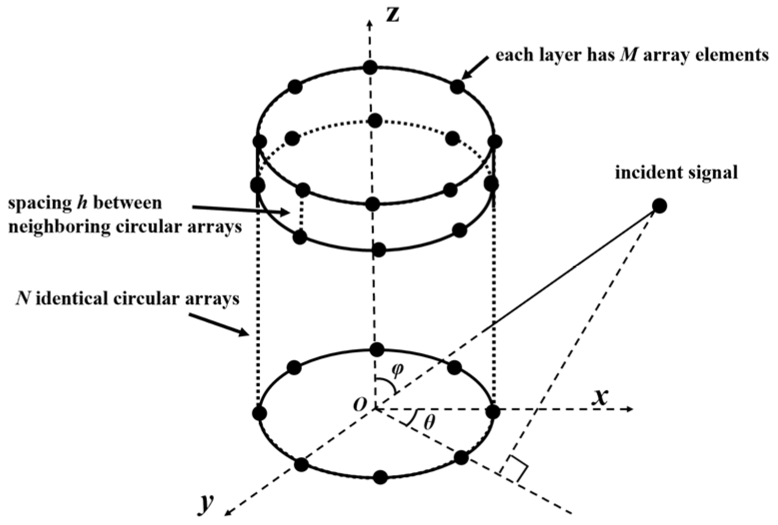 This study employs a uniform cylindrical array model composed of M × N sensor elements. The array consists of N identical circular arrays (UCAs) equally spaced along the cylindrical axis (adjacent UCA spacing denoted as h). Each UCA is perpendicular to the cylinder axis, has a uniform radius R, and contains M uniformly distributed elements. The first element of each UCA is aligned on the same vertical line (parallel to the z-axis), ensuring the symmetry and consistency of the array structure. A schematic diagram of the model is shown in