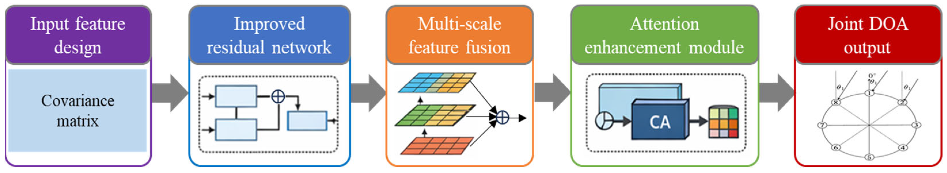 Figure 2, the network consists of five core components: input feature design, an improved residual feature extraction backbone network, multi-scale feature fusion, an attention enhancement module, and a joint DOA output module. This architecture is tailored to the geometric properties of the cylindrical array and the physical characteristics of coherent signal propagation, deeply integrating the prior knowledge of traditional array signal processing with the feature learning capabilities of deep learning. It achieves efficient and robust feature extraction from the signals received by the cylindrical array and enables high-precision DOA estimation.