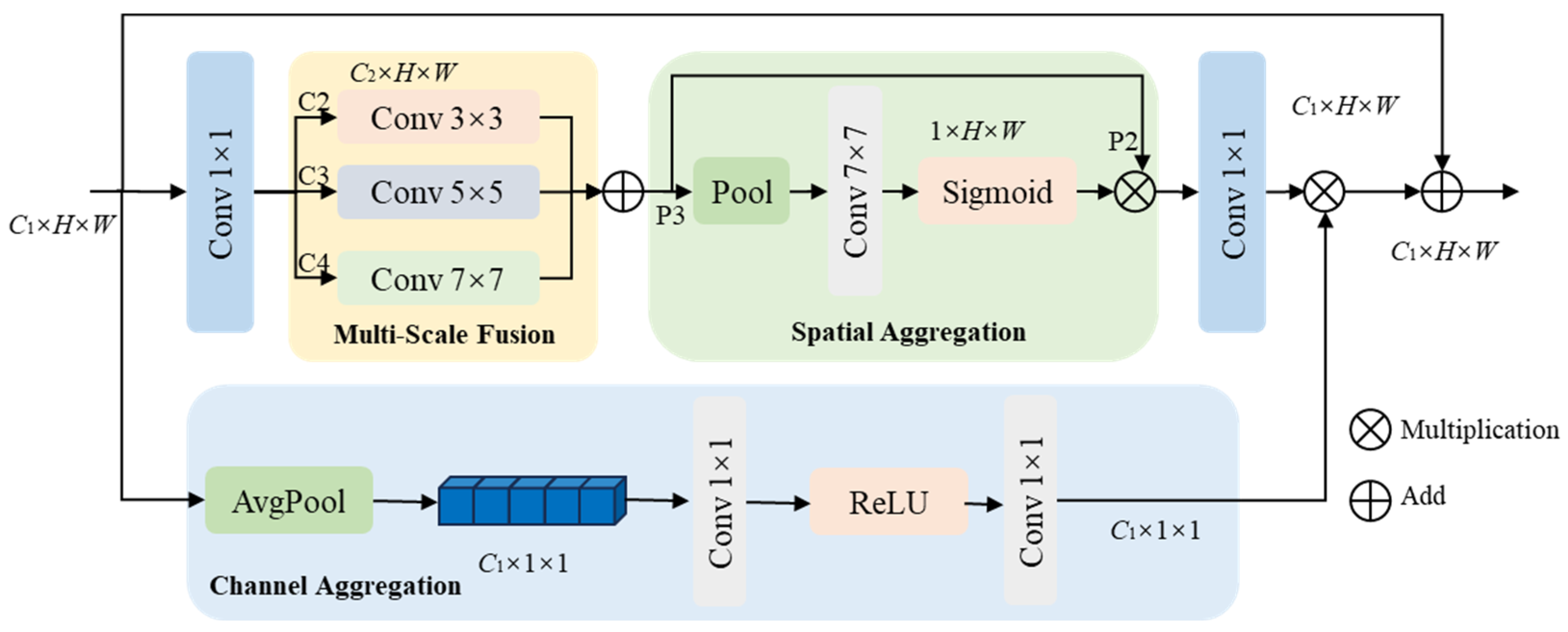 Figure 3, namely Channel Aggregation and Spatial Aggregation. In the Channel Aggregation block, global average pooling is applied to encode global statistical information across channels, followed by two successive 1 × 1 convolution layers with a ReLU activation to model inter-channel dependencies. In parallel, the Spatial Aggregation block aggregates spatial context by applying a pooling operation and a convolutional layer, generating a spatial attention map that emphasizes informative spatial regions. Finally, the refined features are passed through a 1 × 1 convolution to adjust the channel dimension and are combined with the module input via a skip connection, forming a residual learning structure. This residual design facilitates stable gradient propagation and enhances feature representation capability in deep networks.