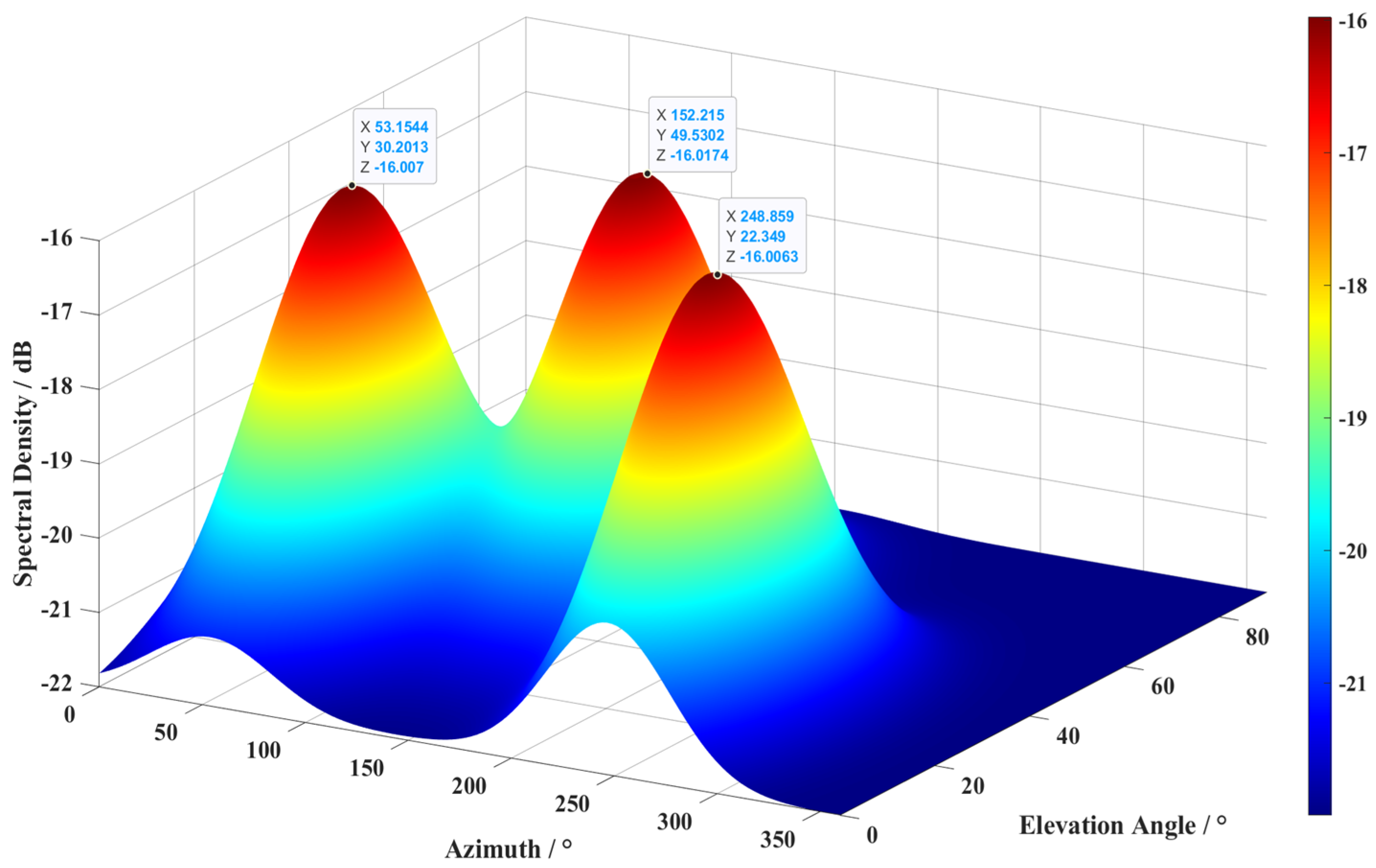 z-axis) represents the Spectral Density (dB). The peak locations directly correspond to the estimated DOAs of the signals. As can be seen from the figure, the spectrum generated by the proposed algorithm exhibits sharp peaks without spurious or missing peaks. The estimated angles for the three signal sources closely match their true values. The specific errors are as follows: for Source 1, the azimuth estimation error is 0.57°, and the elevation error is 0.20°; for Source 2, the azimuth error is 0.20°, and the elevation error is 1.34°; for Source 3, the azimuth error is 1.27°, and the elevation error is 0.53°. All errors are less than 1.5°, verifying the algorithm’s good fundamental estimation accuracy even in multi-source environments.