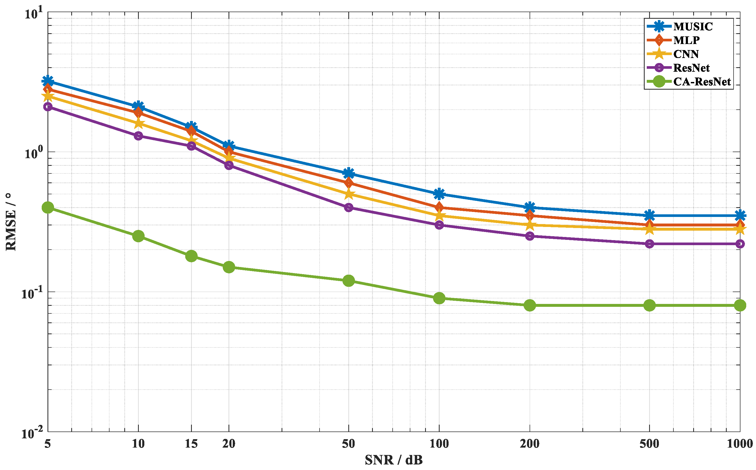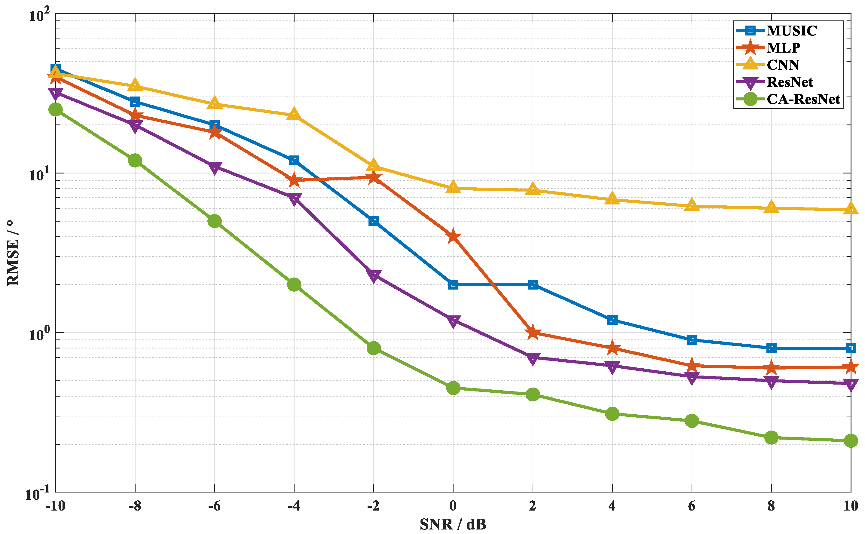 The simulation results show that the proposed algorithm exhibits excellent robustness under low SNR conditions. When the SNR is −10 dB, its RMSE is 25°, significantly lower than that of MUSIC (45°), CNN (42°), ResNet (32°), and MLP (40°). As the SNR increases above 0 dB, the estimation accuracy of the proposed algorithm further improves. At an SNR of 10 dB, the RMSE of CA-ResNet reaches 0.21°, whereas the RMSE of ResNet, the best-performing comparative algorithm under the same condition, is 0.48°. In summary, the proposed algorithm maintains the lowest RMSE across the wide SNR range from −10 dB to 10 dB, demonstrating superior angle estimation accuracy and noise adaptation capability.