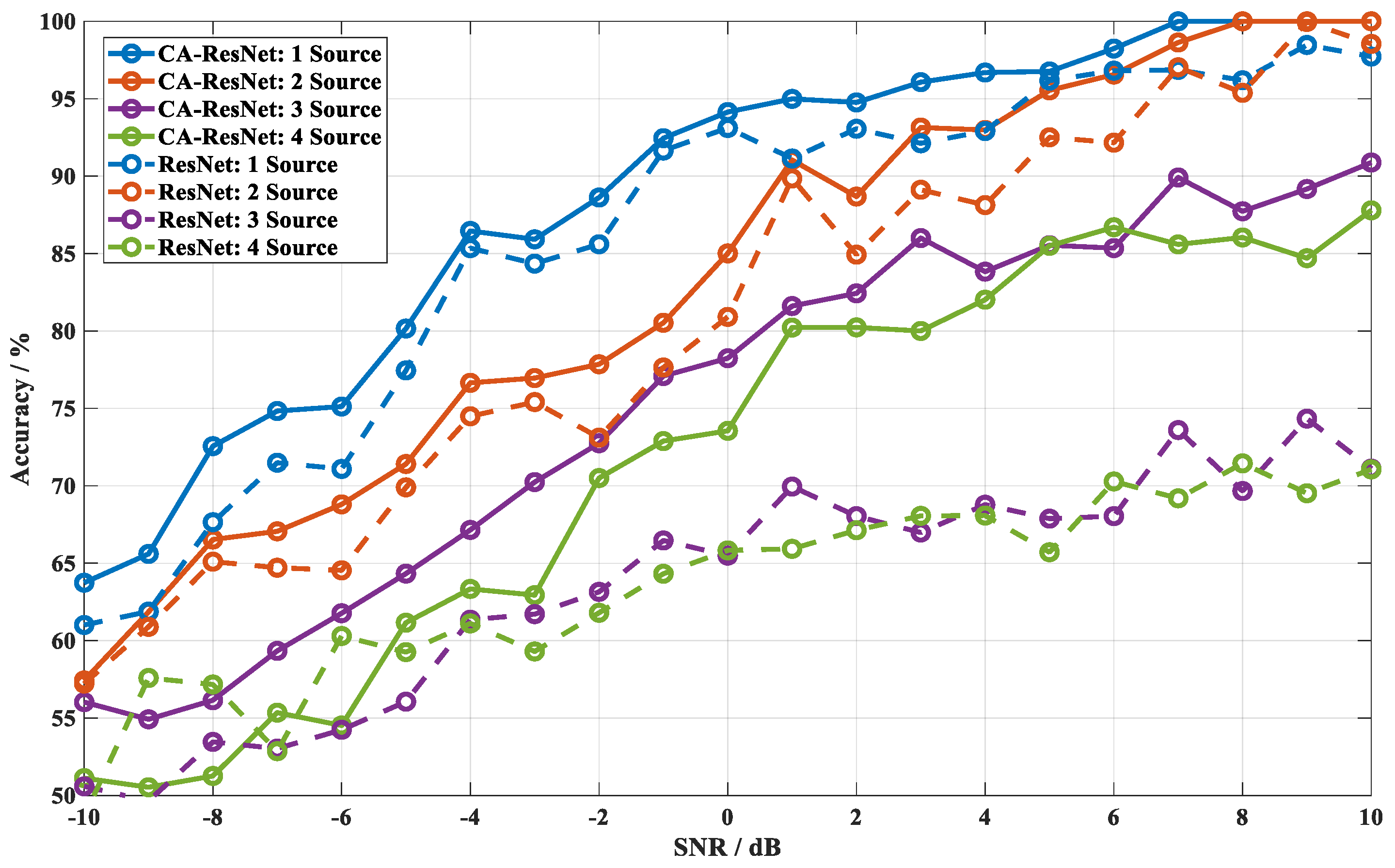 This section uses the accuracy rate as the evaluation metric to validate the estimation performance of the proposed algorithm under different SNR conditions. The accuracy rate is defined as the proportion of samples where the combined RMSE for all signal sources is less than 1° to the total number of samples. The simulation was set up with the number of signal sources ranging from 1 to 4, the angular separation between any two signal sources being no less than 7°, the SNR varying in the range of [−10, 10] dB, and 4000 independent test samples generated for each SNR condition. The proposed algorithm is compared against ResNet, representing an advanced deep learning approach, with the results shown in