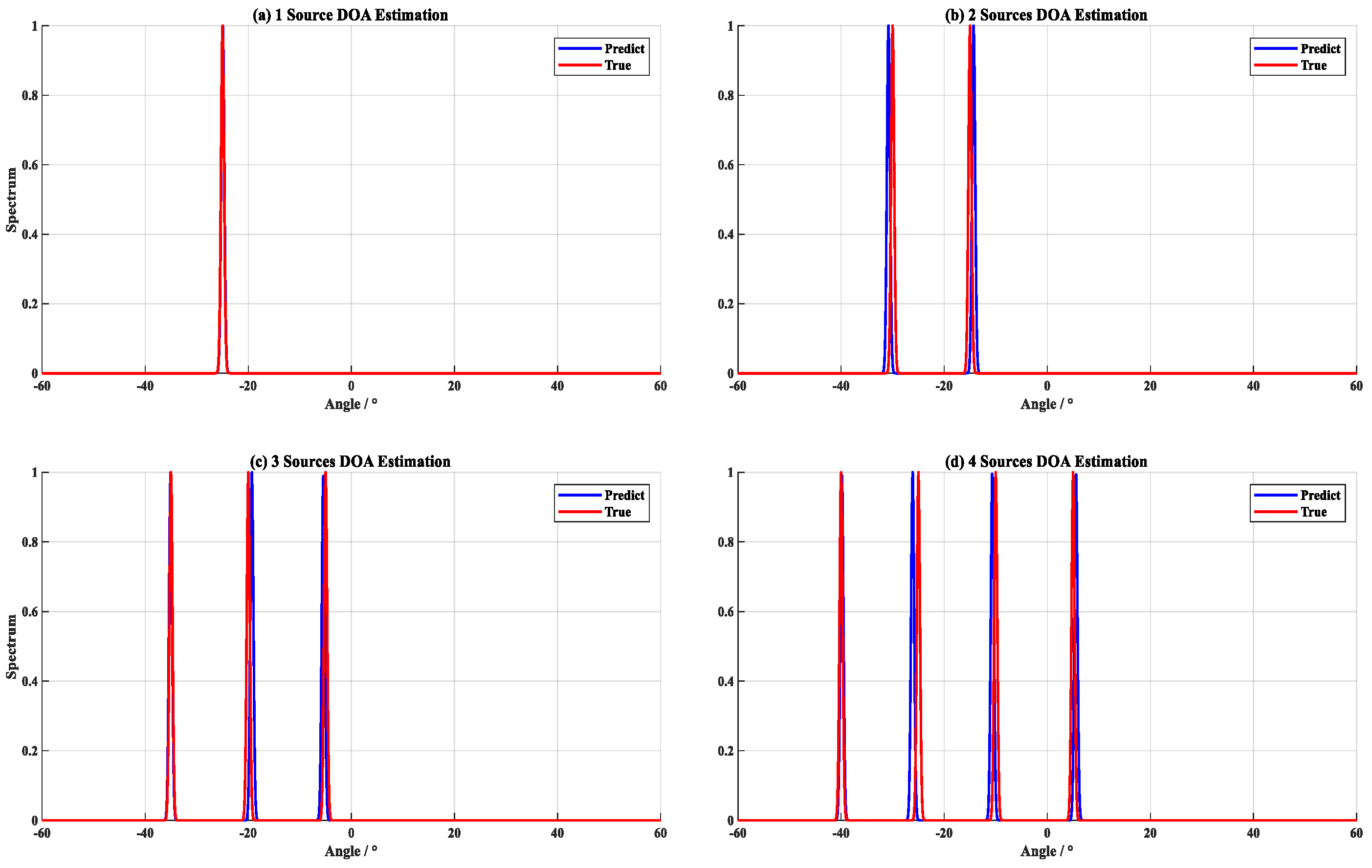 To verify the estimation performance of the proposed algorithm in multi-source scenarios, the simulation set the number of signal sources from 1 to 4. The angles for each source were randomly generated, ensuring an angular separation of no less than 5° between any two sources. The simulation conditions were set to SNR = 20 dB and the number of snapshots L = 1000.