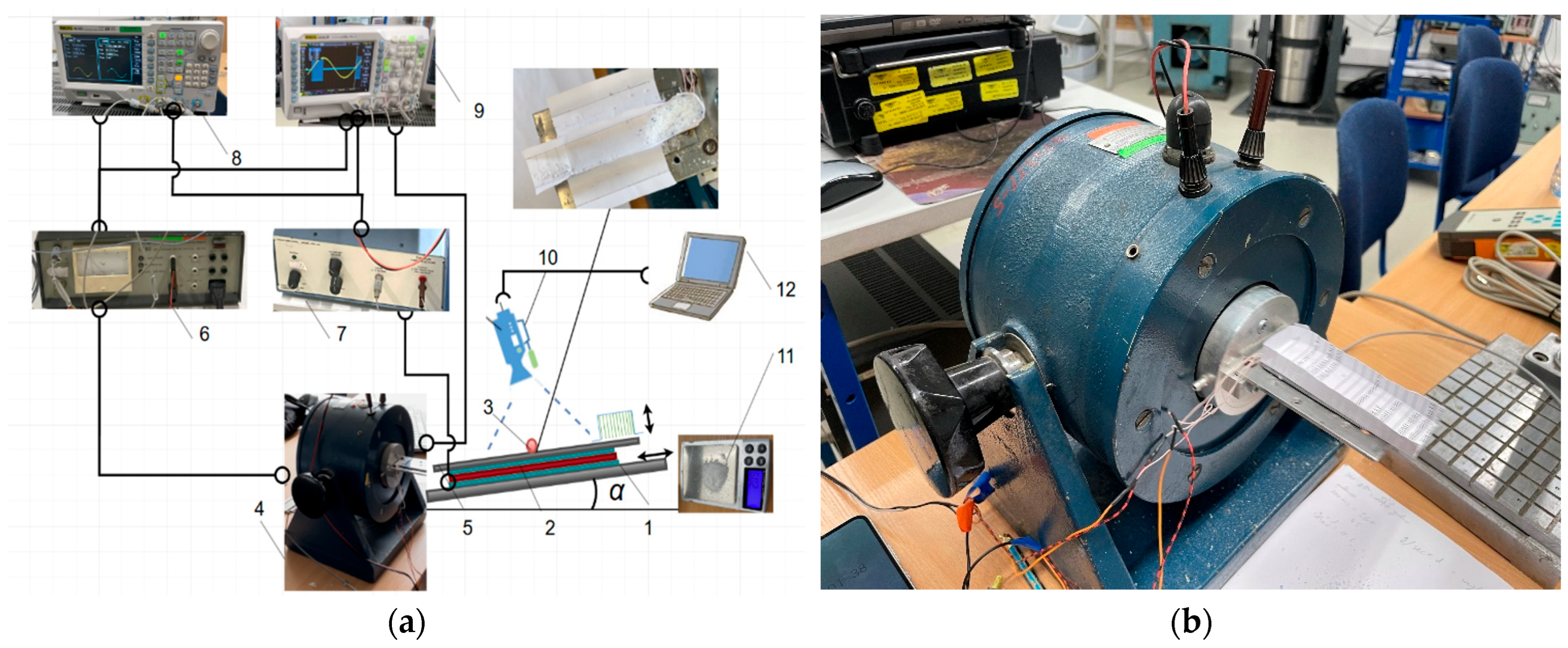 - Vrublevskyi, I. Vibratory conveying by harmonic longitudinal and polyharmonic normal vibrations of inclined conveying track. J. Vib. Acoust. 2022, 144, 011004. [Google Scholar] [CrossRef]