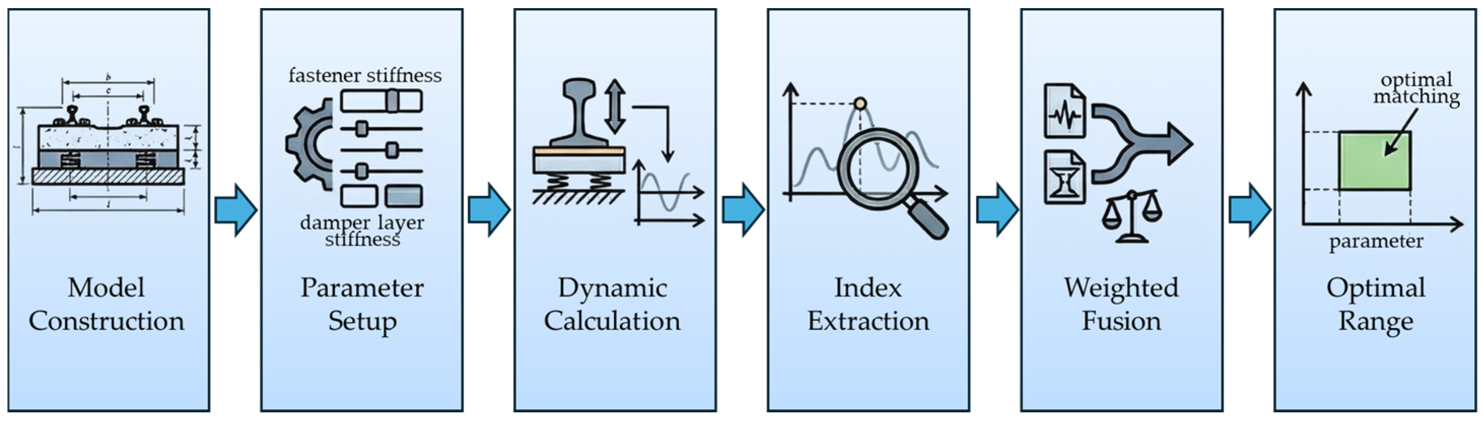 Figure 1. The process begins with the construction of a coupled “vehicle–track” dynamics model. Subsequently, a parametric study is conducted by varying the stiffness of fasteners and damping pads (simulating different material moduli). Based on the simulation results, a decision matrix is formed using indicators of comfort, safety, and durability. Finally, a multi-dimensional fusion algorithm is applied to determine the optimal stiffness range.